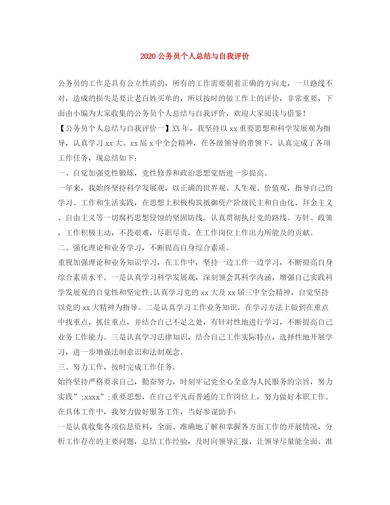 此资料由网络收集而来,如有侵权请告知上传者立即删除。资料共分享,我们负责传递知识。2020公务员个人总结与自我评价公务员的工作是具有公立性质的,所有的工作需要朝着正确的方向走,一旦路线不对,造成的损失是要让老百姓买单的,所以按时的做工作上的评价,非常重要,下面由小编为大家收集的公务员个人总结与自我评价,欢迎大家阅读与借鉴!【公务员个人总结与自我评价一】XX年,我坚持以xx重要思想和科学发展观为指导,认真学习xx大、xx届x中全会精神,在各级领导的带领下,认真完成了各项工作任务,现总结如下:一、自觉加强党性