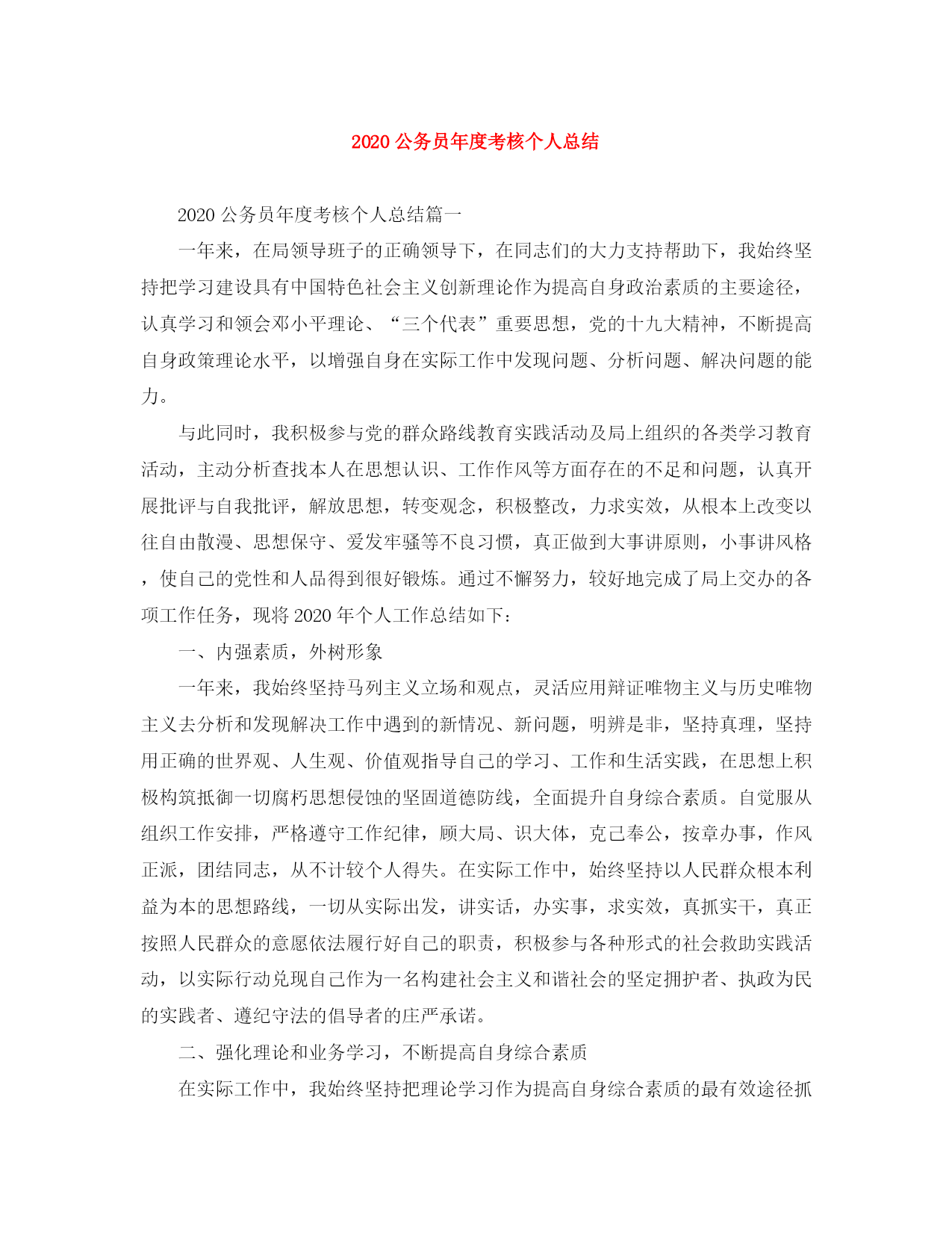 此资料由网络收集而来,如有侵权请告知上传者立即删除。资料共分享,我们负责传递知识。2020公务员年度考核个人总结2020公务员年度考核个人总结篇一一年来,在局领导班子的正确领导下,在同志们的大力支持帮助下,我始终坚持把学习建设具有中国特色社会主义创新理论作为提高自身政治素质的主要途径,认真学习和领会邓小平理论、“三个代表”重要思想,党的十九大精神,不断提高自身政策理论水平,以增强自身在实际工作中发现问题、分析问题、解决问题的能力。与此同时,我积极参与党的群众路线教育实践活动及局上组织的各类学习教育活动,主