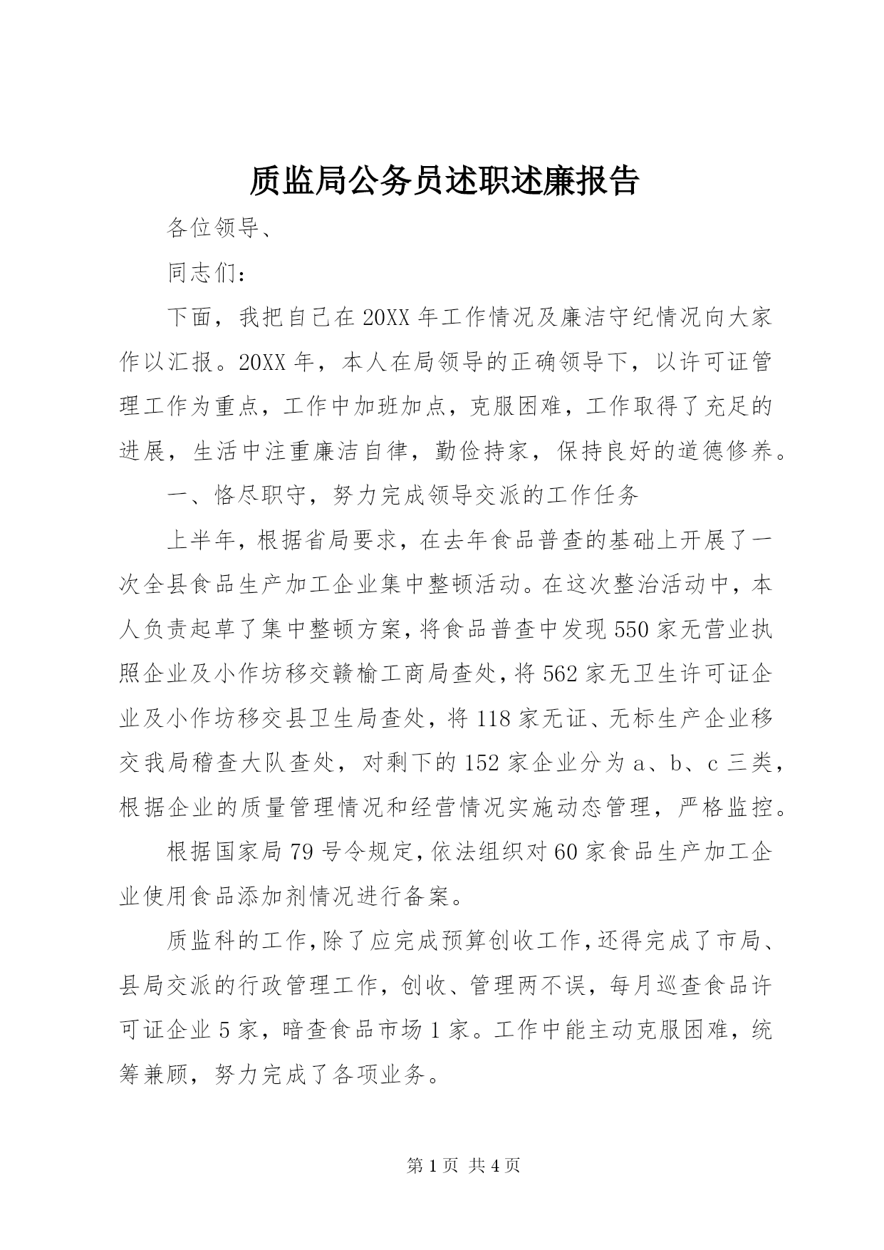 第PAGE\*Arabic\*MERGEFORMAT4页共NUMPAGES\*MERGEFORMAT4页质监局公务员述职述廉报告各位领导、同志们:下面,我把自己在20XX年工作情况及廉洁守纪情况向大家作以汇报。20XX年,本人在局领导的正确领导下,以许可证管理工作为重点,工作中加班加点,克服困难,工作取得了充足的进展,生活中注重廉洁自律,勤俭持家,保持良好的道德修养。一、恪尽职守,努力完成领导交派的工作任务上半年,根据省局要求,在去年食品普查的基础上开展了一次全县食品生产加工企业集中整顿活动。