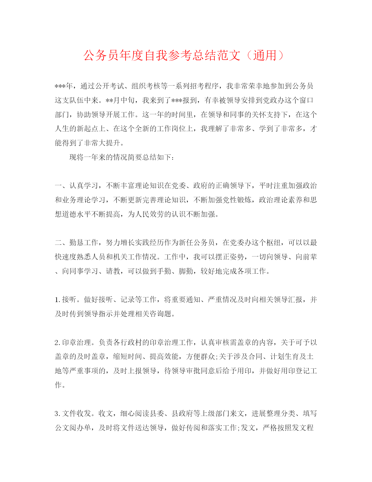 公务员年度自我参考总结范文(通用)***年,通过公开考试、组织考核等一系列招考程序,我非常荣幸地参加到公务员这支队伍中来。**月中旬,我来到了***报到,有幸被领导安排到党政办这个窗口部门,协助领导开展工作。这一年的时间里,在领导和同事的关怀支持下,在这个人生的新起点上、在这个全新的工作岗位上,我理解了非常多、学到了非常多,才能得到了非常大提升。现将一年来的情况简要总结如下:一、认真学习,不断丰富理论知识在党委、政府的正确领导下,平时注重加强政治和业务理论学习,不断更新完善理论知识,不断加强党性锻炼,政治