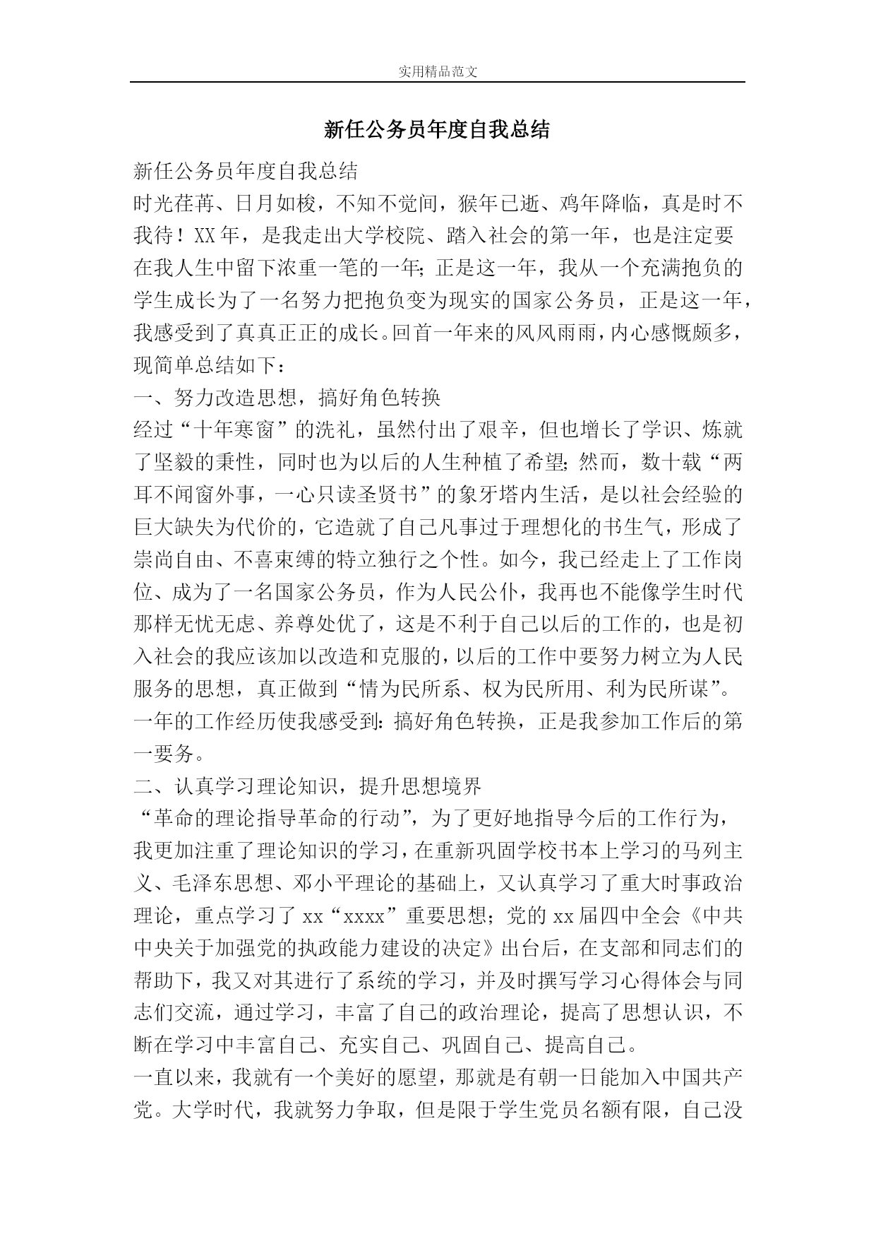 实用精品范文新任公务员年度自我总结新任公务员年度自我总结时光荏苒、日月如梭,不知不觉间,猴年已逝、鸡年降临,真是时不我待!XX年,是我走出大学校院、踏入社会的第一年,也是注定要在我人生中留下浓重一笔的一年;正是这一年,我从一个充满抱负的学生成长为了一名努力把抱负变为现实的国家公务员,正是这一年,我感受到了真真正正的成长。回首一年来的风风雨雨,内心感慨颇多,现简单总结如下:一、努力改造思想,搞好角色转换经过“十年寒窗”的洗礼,虽然付出了艰辛,但也增长了学识、炼就了坚毅的秉性,同时也为以后的人生种植了希望;然
