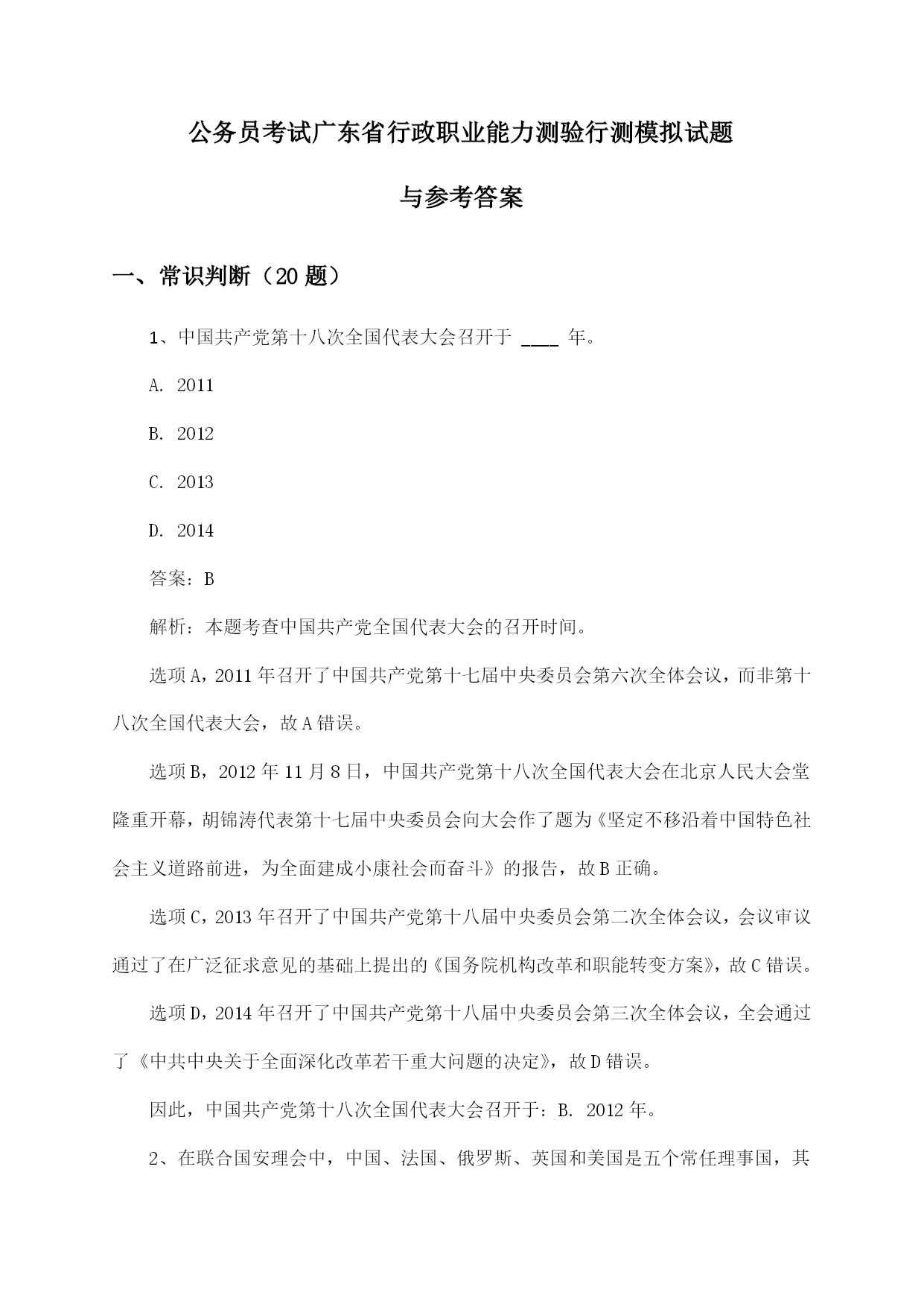 公务员考试广东省行政职业能力测验行测模拟试题与参考答案一、常识判断(20题)1、中国共产党第十八次全国代表大会召开于____年。A.2011B.2012C.2013D.2014答案:B解析:本题考查中国共产党全国代表大会的召开时间。选项A,2011年召开了中国共产党第十七届中央委员会第六次全体会议,而非第十八次全国代表大会,故A错误。选项B,2012年11月8日,中国共产党第十八次全国代表大会在北京人民大会堂隆重开幕,胡锦涛代表第十七届中央委员会向大会作了题为《坚定不移沿着中国特色社会主义道路前进,为全面