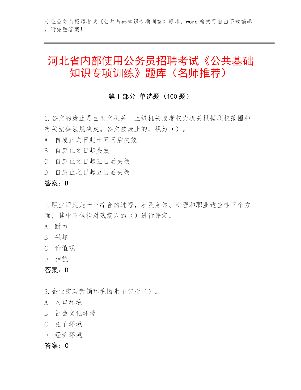 专业公务员招聘考试《公共基础知识专项训练》题库,word格式可自由下载编辑,附完整答案!河北省内部使用公务员招聘考试《公共基础知识专项训练》题库(名师推荐)第I部分单选题(100题)1.公文的废止是由发文机关、上级机关或者权力机关根据职权范围和有关法律法规决定。公文被废止的,视为()。A:自废止之日起十五日后失效B:自废止之日起失效C:自废止之日起三日后失效D:自废止之日起五日后失效答案:B2.职业评定是一个综合的过程,涉及身体、心理和职业适应性三个方面,其中不包括对残疾人的()进行评定。A:耐力B:兴趣