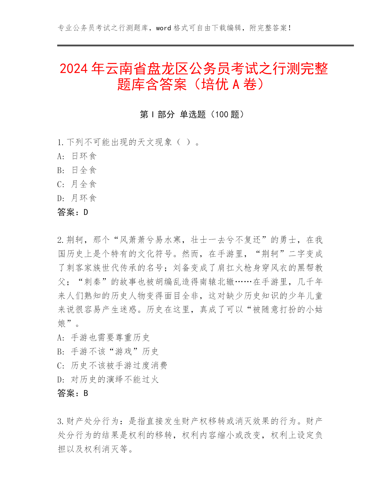 专业公务员考试之行测题库,word格式可自由下载编辑,附完整答案!2024年云南省盘龙区公务员考试之行测完整题库含答案(培优A卷)第I部分单选题(100题)1.下列不可能出现的天文现象()。A:日环食B:日全食C:月全食D:月环食答案:D2.荆轲,那个“风萧萧兮易水寒,壮士一去兮不复还”的勇士,在我国历史上是个特有的文化符号。然而,在手游里,“荆轲”二字变成了刺客家族世代传承的名号;刘备变成了肩扛火枪身穿风衣的黑帮教父;“刺秦”的故事也被胡编乱造得南辕北辙……在手游里,几千年来人们熟知的历史人物变得面目全