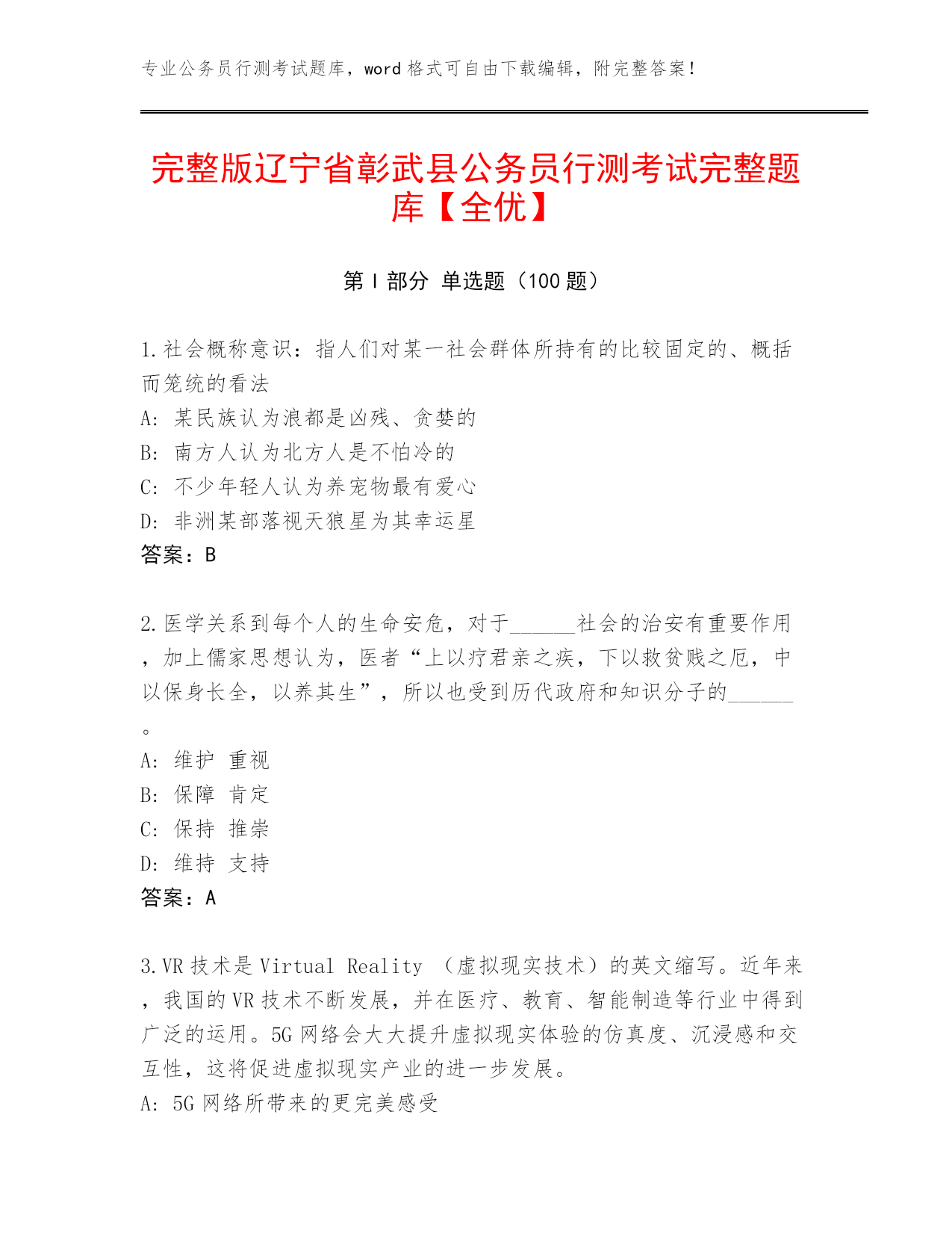 专业公务员行测考试题库,word格式可自由下载编辑,附完整答案!完整版辽宁省彰武县公务员行测考试完整题库【全优】第I部分单选题(100题)1.社会概称意识:指人们对某一社会群体所持有的比较固定的、概括而笼统的看法A:某民族认为浪都是凶残、贪婪的B:南方人认为北方人是不怕冷的C:不少年轻人认为养宠物最有爱心D:非洲某部落视天狼星为其幸运星答案:B2.医学关系到每个人的生命安危,对于______社会的治安有重要作用,加上儒家思想认为,医者“上以疗君亲之疾,下以救贫贱之厄,中以保身长全,以养其生”,所以也受到历