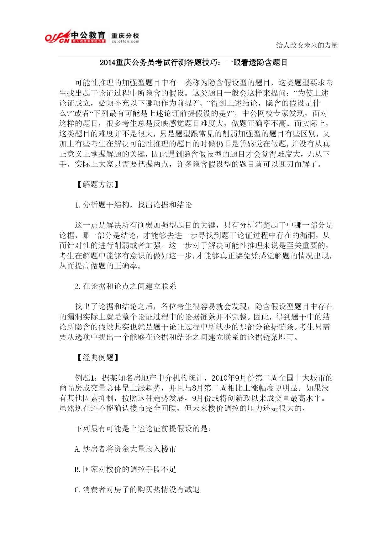 2014重庆公务员考试行测答题技巧:一眼看透隐含题目.doc