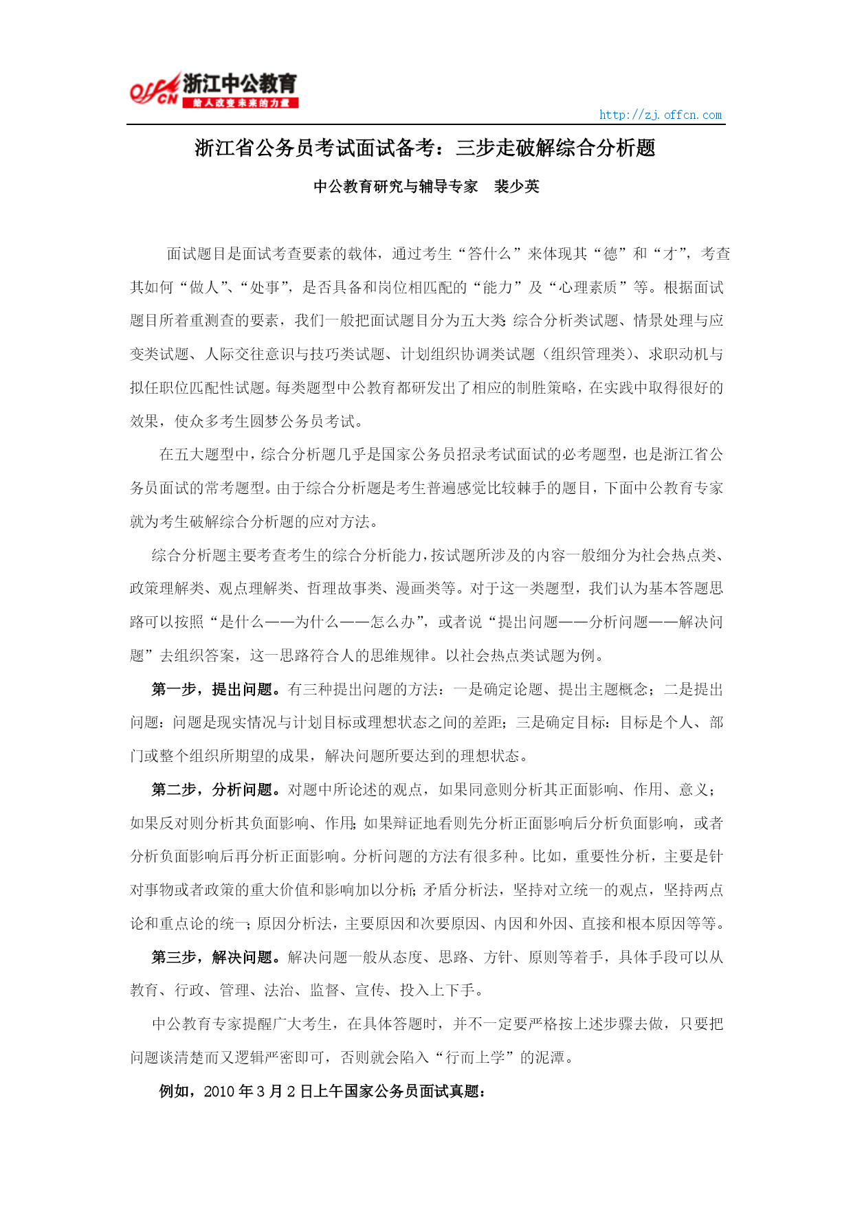 http://zj.offcn.com浙江省公务员考试面试备考:三步走破解综合分析题中公教育研究与辅导专家裴少英面试题目是面试考查要素的载体,通过考生“答什么”来体现其“德”和“才”,考查其如何“做人”、“处事”,是否具备和岗位相匹配的“能力”及“心理素质”等。根据面试题目所着重测查的要素,我们一般把面试题目分为五大类:综合分析类试题、情景处理与应变类试题、人际交往意识与技巧类试题、计划组织协调类试题(组织管理类)、求职动机与拟任职位匹配性试题。每类题型中公教育都研发出了相应的制胜策略,在实践中取得很好的