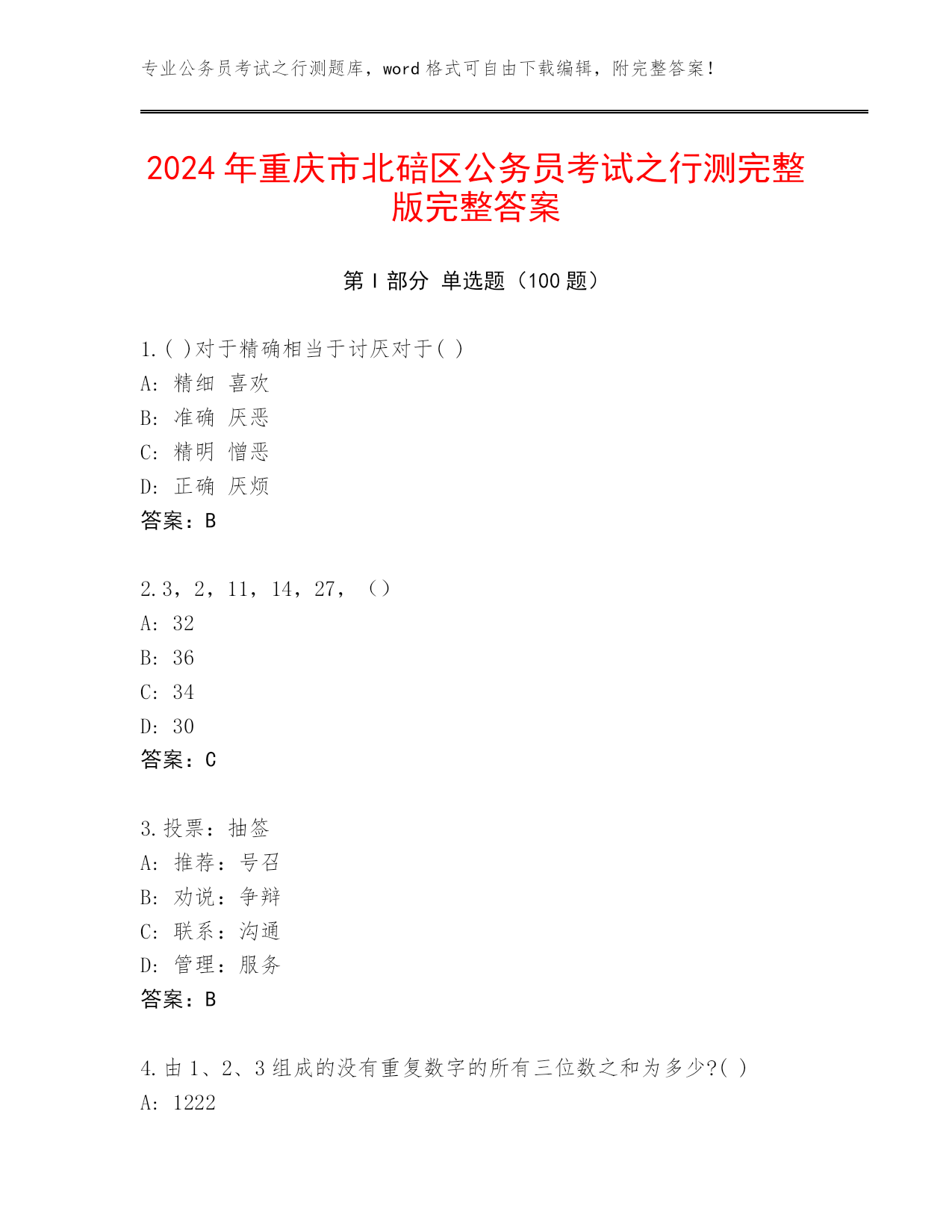 专业公务员考试之行测题库,word格式可自由下载编辑,附完整答案!2024年重庆市北碚区公务员考试之行测完整版完整答案第I部分单选题(100题)1.()对于精确相当于讨厌对于()A:精细喜欢B:准确厌恶C:精明憎恶D:正确厌烦答案:B2.3,2,11,14,27,()A:32B:36C:34D:30答案:C3.投票:抽签A:推荐:号召B:劝说:争辩C:联系:沟通D:管理:服务答案:B4.由1、2、3组成的没有重复数字的所有三位数之和为多少?()A:1222B:1332C:1322D:1232答案:B5.山