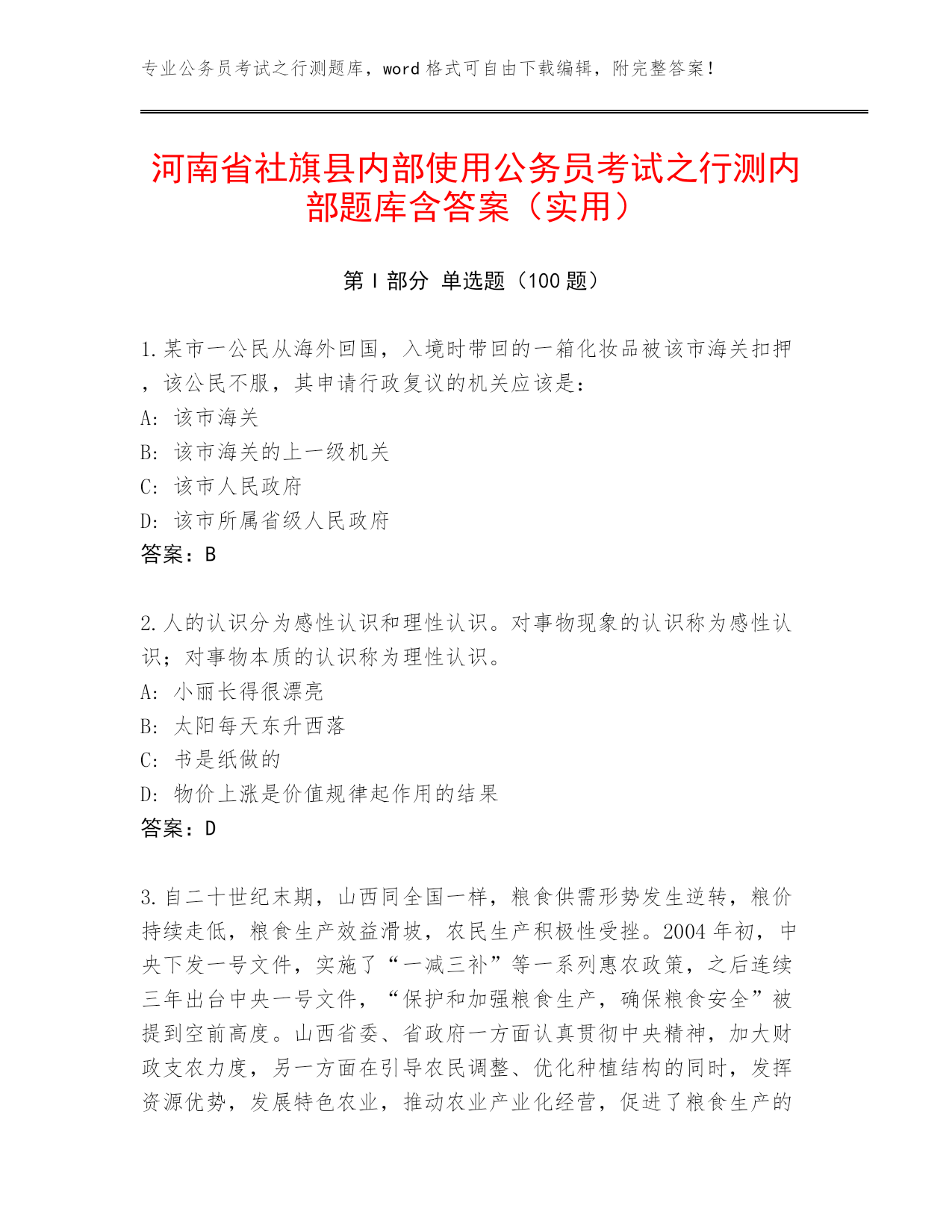 专业公务员考试之行测题库,word格式可自由下载编辑,附完整答案!河南省社旗县内部使用公务员考试之行测内部题库含答案(实用)第I部分单选题(100题)1.某市一公民从海外回国,入境时带回的一箱化妆品被该市海关扣押,该公民不服,其申请行政复议的机关应该是:A:该市海关B:该市海关的上一级机关C:该市人民政府D:该市所属省级人民政府答案:B2.人的认识分为感性认识和理性认识。对事物现象的认识称为感性认识;对事物本质的认识称为理性认识。A:小丽长得很漂亮B:太阳每天东升西落C:书是纸做的D:物价上涨是价值规律起