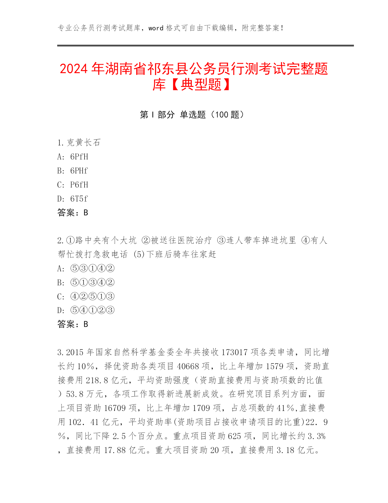 专业公务员行测考试题库,word格式可自由下载编辑,附完整答案!2024年湖南省祁东县公务员行测考试完整题库【典型题】第I部分单选题(100题)1.克黄长石A:6PfHB:6PHfC:P6fHD:6T5f答案:B2.①路中央有个大坑②被送往医院治疗③连人带车掉进坑里④有人帮忙拨打急救电话(5)下班后骑车往家赶A:⑤③①④②B:⑤①③④②C:④②⑤①③D:⑤④①②③答案:B3.2015年国家自然科学基金委全年共接收173017项各类申请,同比增长约10%,择优资助各类项目40668项,比上年增加1579项,