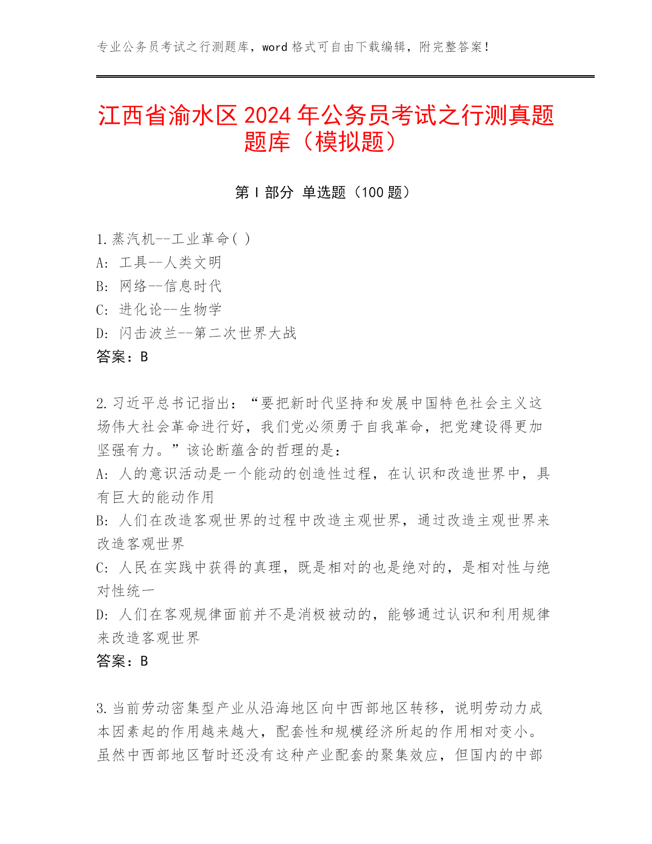 专业公务员考试之行测题库,word格式可自由下载编辑,附完整答案!江西省渝水区2024年公务员考试之行测真题题库(模拟题)第I部分单选题(100题)1.蒸汽机--工业革命()A:工具--人类文明B:网络--信息时代C:进化论--生物学D:闪击波兰--第二次世界大战答案:B2.习近平总书记指出:“要把新时代坚持和发展中国特色社会主义这场伟大社会革命进行好,我们党必须勇于自我革命,把党建设得更加坚强有力。”该论断蕴含的哲理的是:A:人的意识活动是一个能动的创造性过程,在认识和改造世界中,具有巨大的能动作用B: