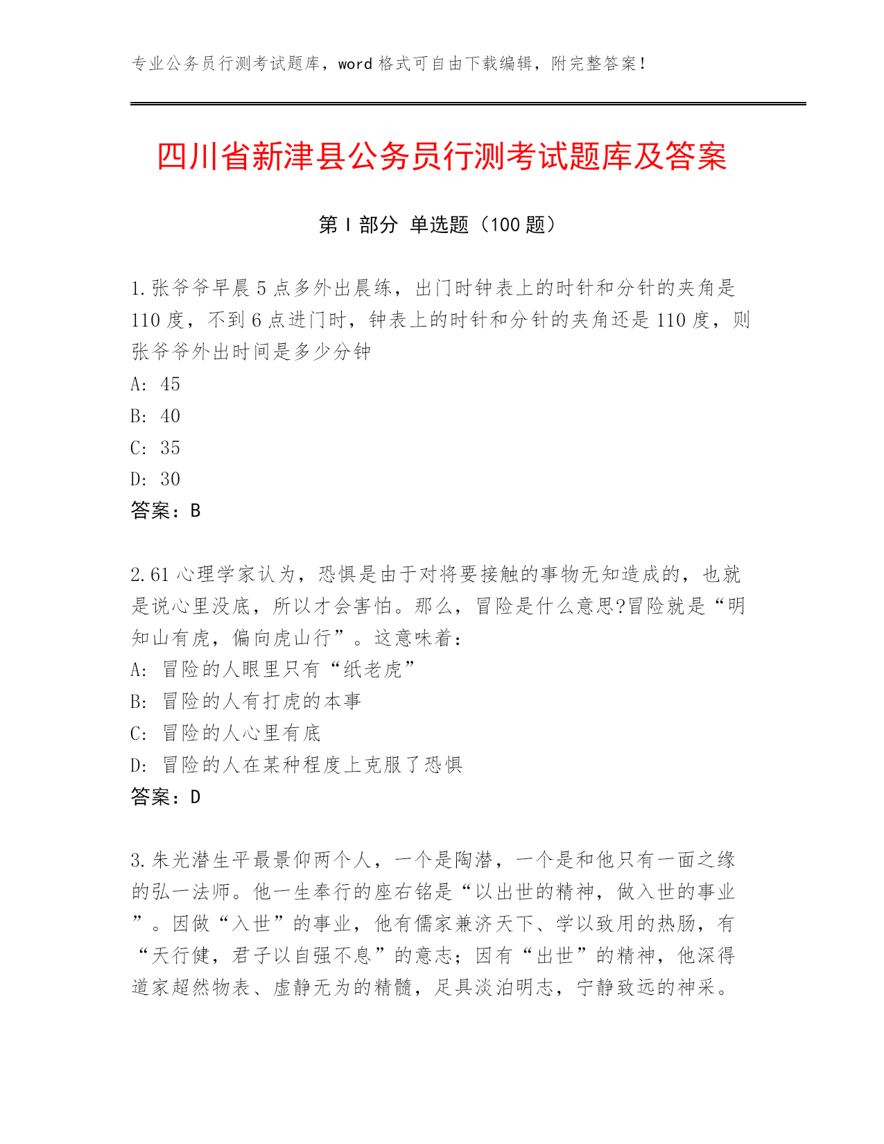 专业公务员行测考试题库,word格式可自由下载编辑,附完整答案!四川省新津县公务员行测考试题库及答案第I部分单选题(100题)1.张爷爷早晨5点多外出晨练,出门时钟表上的时针和分针的夹角是110度,不到6点进门时,钟表上的时针和分针的夹角还是110度,则张爷爷外出时间是多少分钟A:45B:40C:35D:30答案:B2.61心理学家认为,恐惧是由于对将要接触的事物无知造成的,也就是说心里没底,所以才会害怕。那么,冒险是什么意思?冒险就是“明知山有虎,偏向虎山行”。这意味着:A:冒险的人眼里只有“纸老虎”B