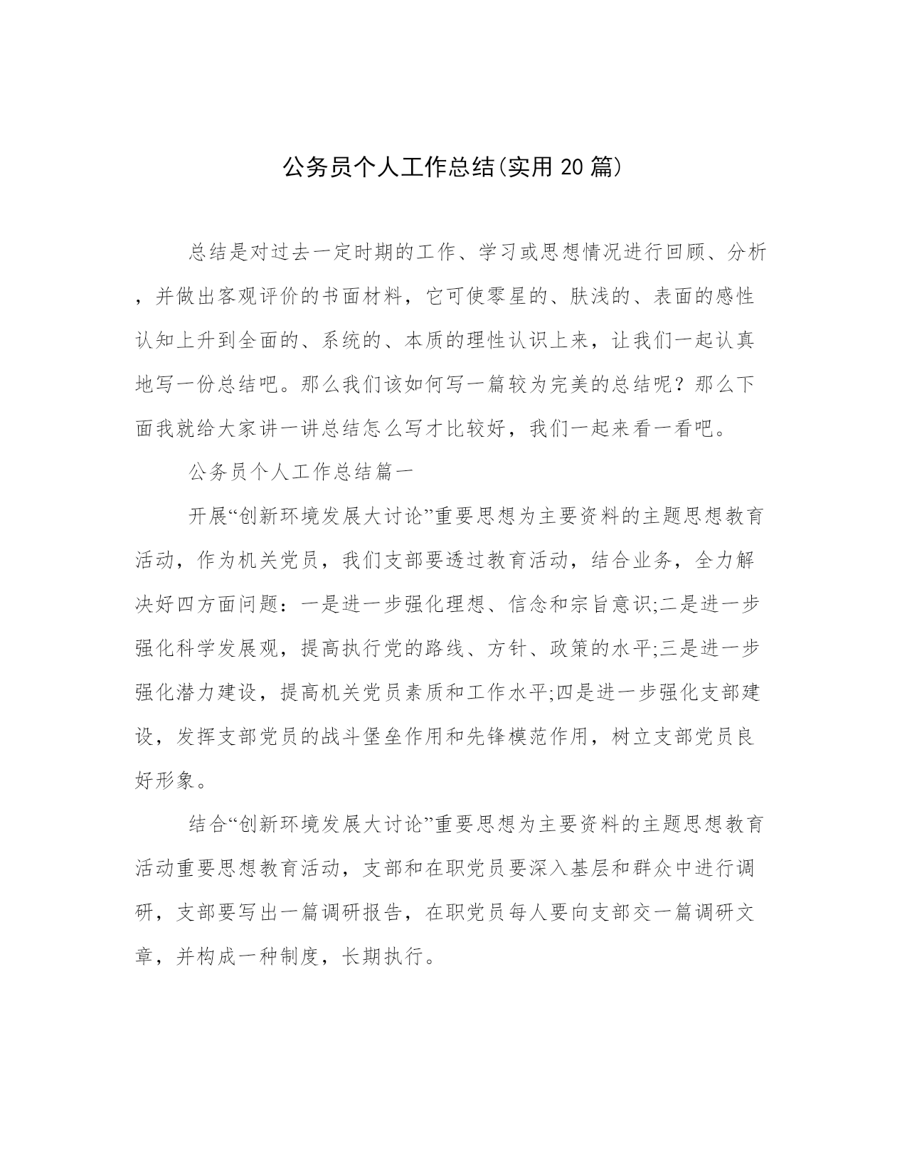 公务员个人工作总结(实用20篇)总结是对过去一定时期的工作、学习或思想情况进行回顾、分析,并做出客观评价的书面材料,它可使零星的、肤浅的、表面的感性认知上升到全面的、系统的、本质的理性认识上来,让我们一起认真地写一份总结吧。那么我们该如何写一篇较为完美的总结呢?那么下面我就给大家讲一讲总结怎么写才比较好,我们一起来看一看吧。公务员个人工作总结篇一开展“创新环境发展大讨论”重要思想为主要资料的主题思想教育活动,作为机关党员,我们支部要透过教育活动,结合业务,全力解决好四方面问题:一是进一步强化理想、信念和宗