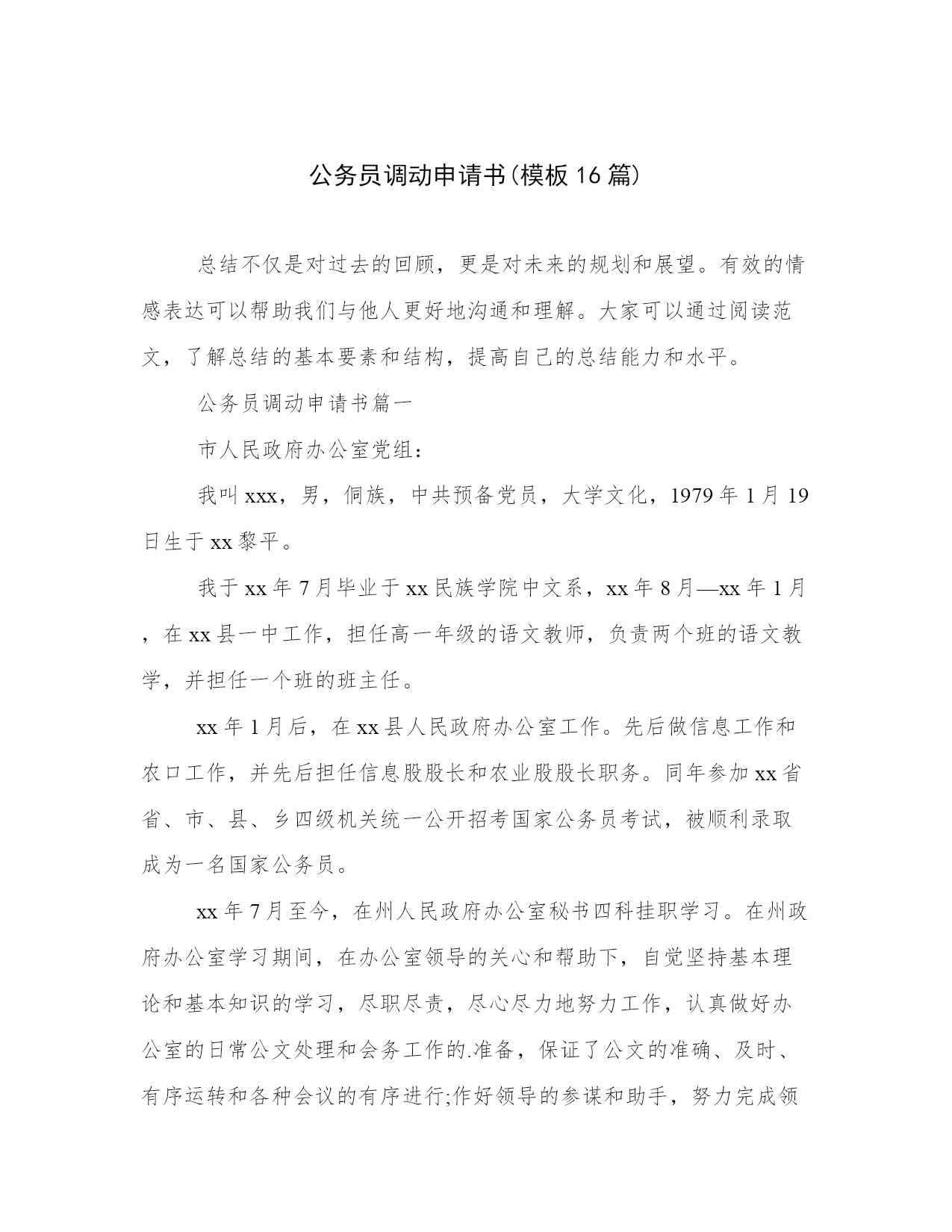 公务员调动申请书(模板16篇)总结不仅是对过去的回顾,更是对未来的规划和展望。有效的情感表达可以帮助我们与他人更好地沟通和理解。大家可以通过阅读范文,了解总结的基本要素和结构,提高自己的总结能力和水平。公务员调动申请书篇一市人民政府办公室党组:我叫xxx,男,侗族,中共预备党员,大学文化,1979年1月19日生于xx黎平。我于xx年7月毕业于xx民族学院中文系,xx年8月—xx年1月,在xx县一中工作,担任高一年级的语文教师,负责两个班的语文教学,并担任一个班的班主任。xx年1月后,在xx县人民政府办公室