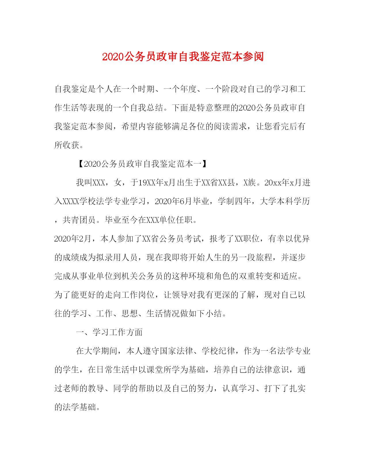 PAGE此资料由网络收集而来,如有侵权请告知上传者立即删除。资料共分享,我们负责传递知识。2020公务员政审自我鉴定范本参阅自我鉴定是个人在一个时期、一个年度、一个阶段对自己的学习和工作生活等表现的一个自我总结。下面是特意整理的2020公务员政审自我鉴定范本参阅,希望内容能够满足各位的阅读需求,让您看完后有所收获。【2020公务员政审自我鉴定范本一】我叫XXX,女,于19XX年x月出生于XX省XX县,X族。20xx年x月进入XXXX学校法学专业学习,2020年6月毕业,学制四年,大学本科学历,共青团