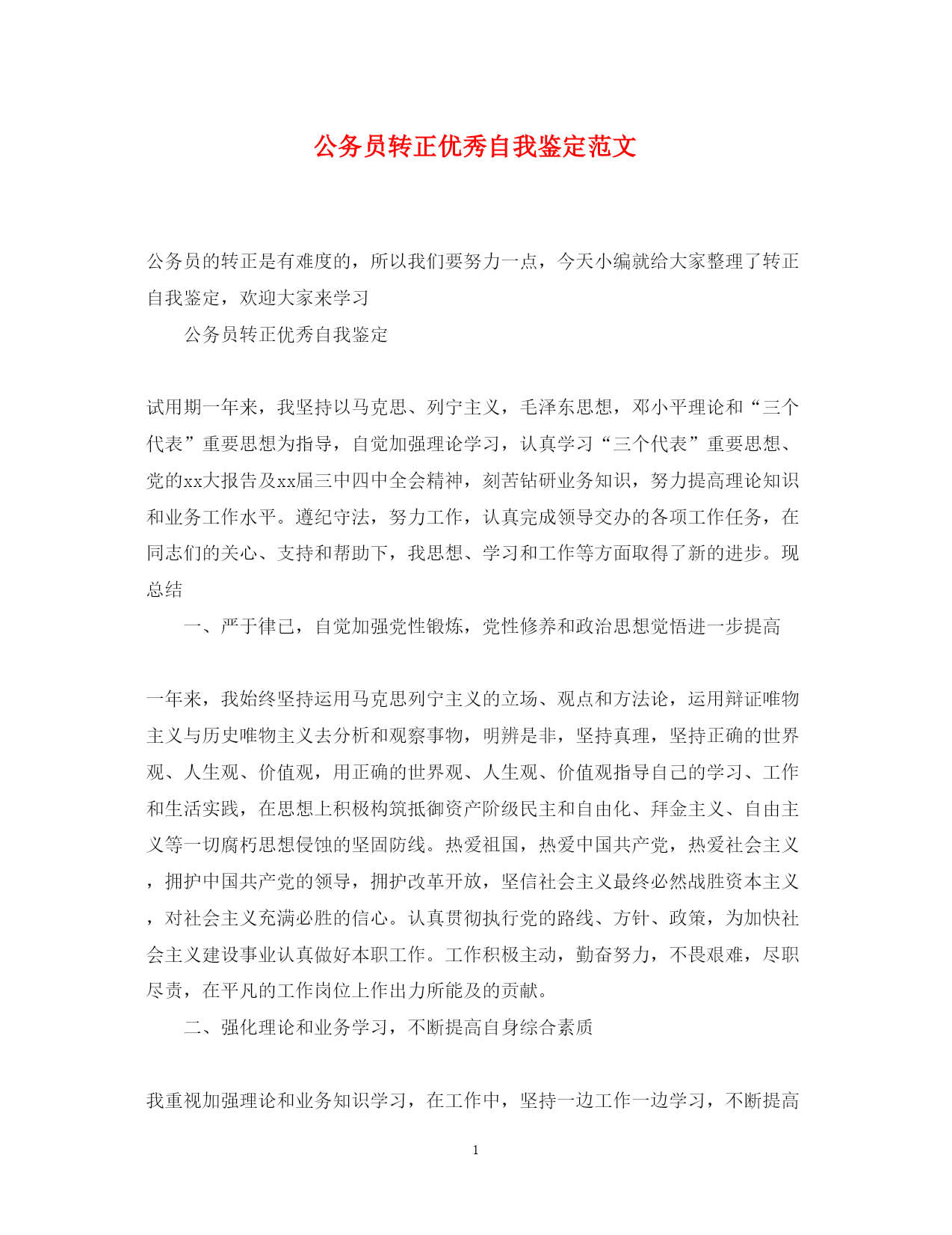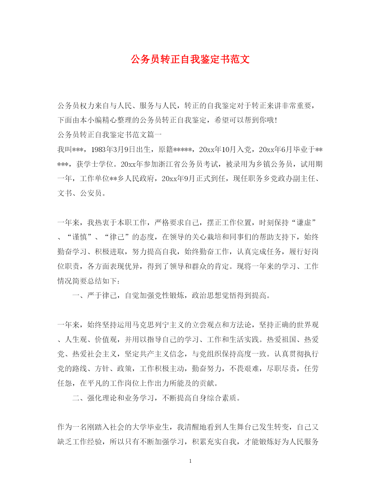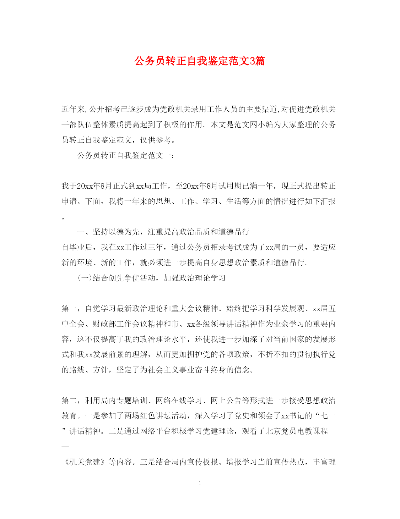 此资料由网络收集而来,如有侵权请告知上传者立即删除。资料共分享,我们负责传递知识。PAGEPAGE9公务员转正自我鉴定范文3篇近年来,公开招考已逐步成为党政机关录用工作人员的主要渠道,对促进党政机关干部队伍整体素质提高起到了积极的作用。本文是范文网小编为大家整理的公务员转正自我鉴定范文,仅供参考。公务员转正自我鉴定范文一:我于20xx年8月正式到xx局工作,至20xx年8月试用期已满一年,现正式提出转正申请。下面,我将一年来的思想、工作、学习、生活等方面的情况进行如下汇报。一、坚持以德为先,注