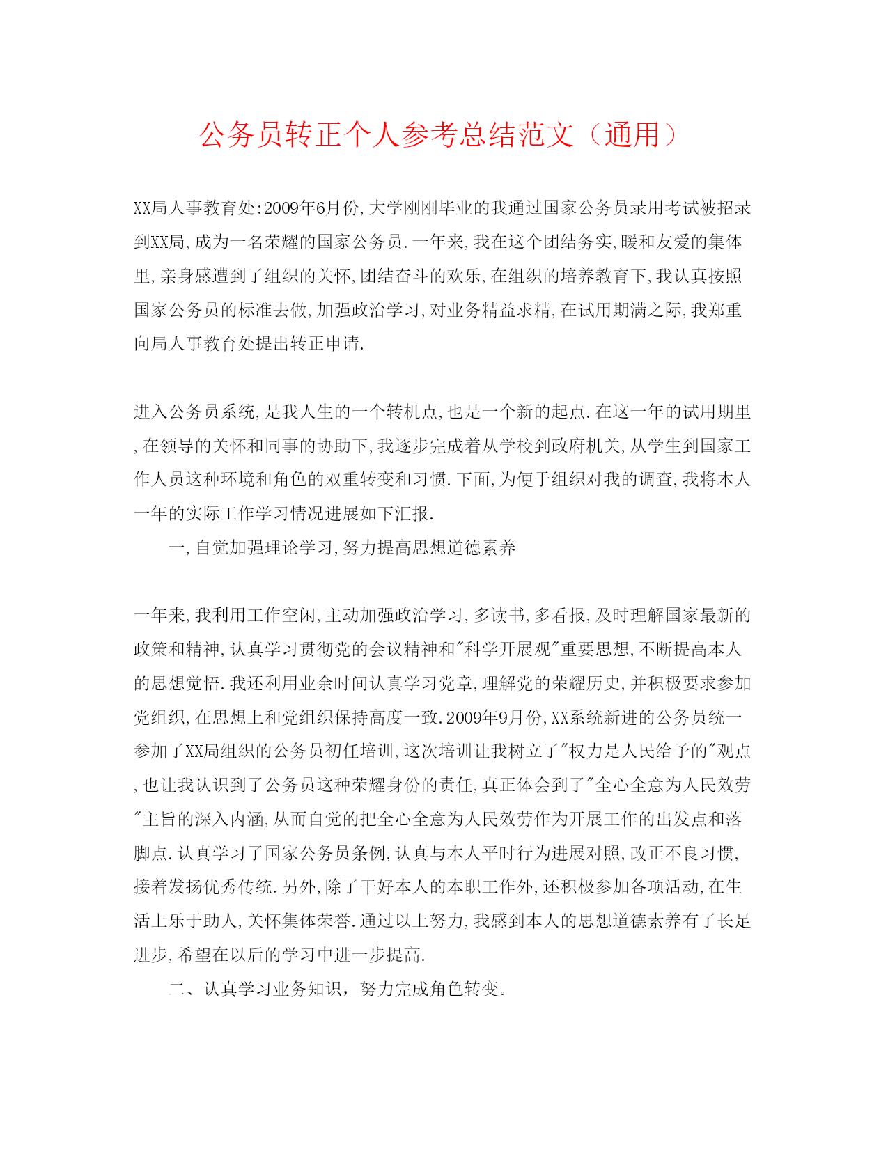 公务员转正个人参考总结范文(通用)XX局人事教育处:2009年6月份,大学刚刚毕业的我通过国家公务员录用考试被招录到XX局,成为一名荣耀的国家公务员.一年来,我在这个团结务实,暖和友爱的集体里,亲身感遭到了组织的关怀,团结奋斗的欢乐,在组织的培养教育下,我认真按照国家公务员的标准去做,加强政治学习,对业务精益求精,在试用期满之际,我郑重向局人事教育处提出转正申请.进入公务员系统,是我人生的一个转机点,也是一个新的起点.在这一年的试用期里,在领导的关怀和同事的协助下,我逐步完成着从学校到政府机关,从学生到国