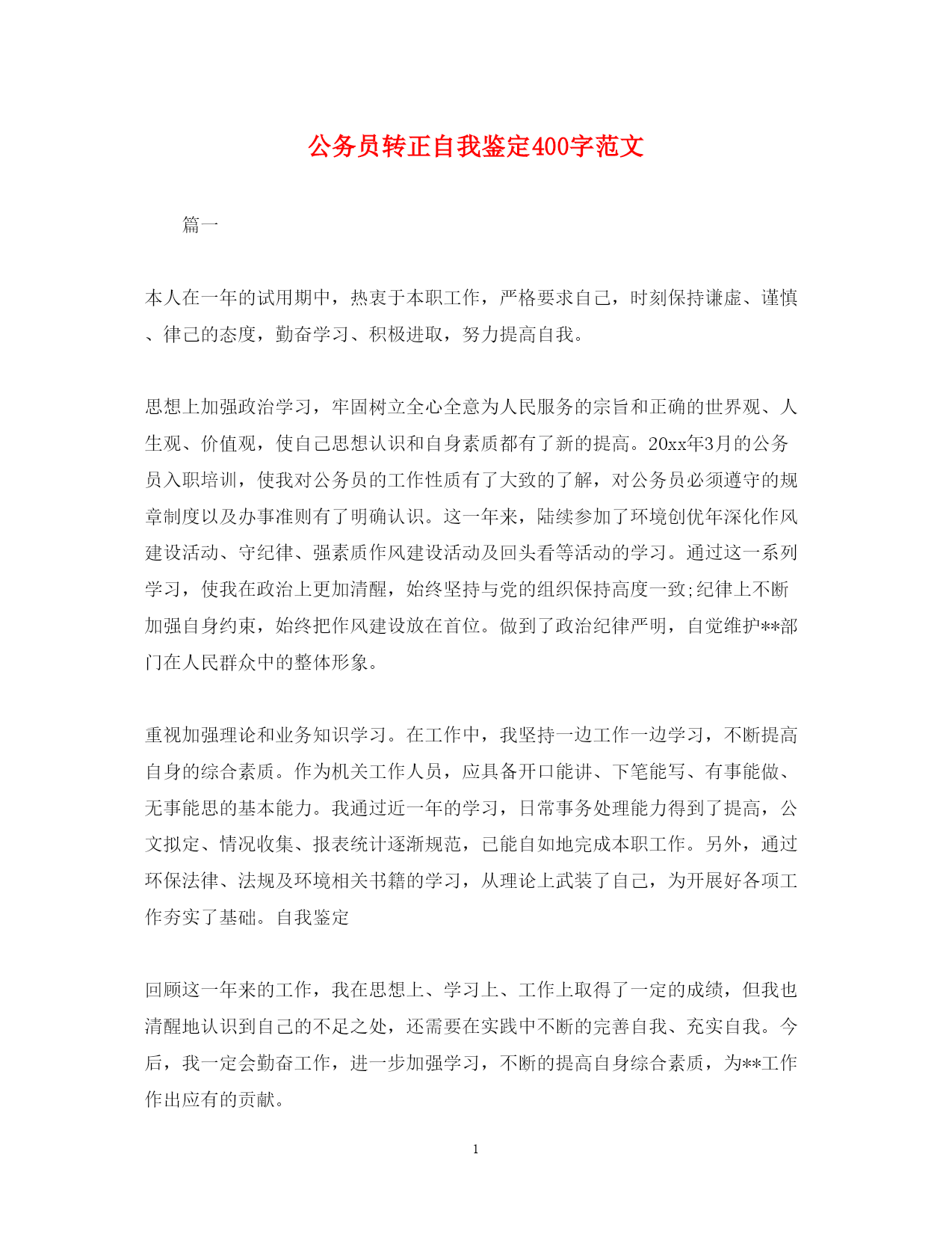 此资料由网络收集而来,如有侵权请告知上传者立即删除。资料共分享,我们负责传递知识。PAGEPAGE3公务员转正自我鉴定400字范文篇一本人在一年的试用期中,热衷于本职工作,严格要求自己,时刻保持谦虚、谨慎、律己的态度,勤奋学习、积极进取,努力提高自我。思想上加强政治学习,牢固树立全心全意为人民服务的宗旨和正确的世界观、人生观、价值观,使自己思想认识和自身素质都有了新的提高。20xx年3月的公务员入职培训,使我对公务员的工作性质有了大致的了解,对公务员必须遵守的规章制度以及办事准则有了明确认识。