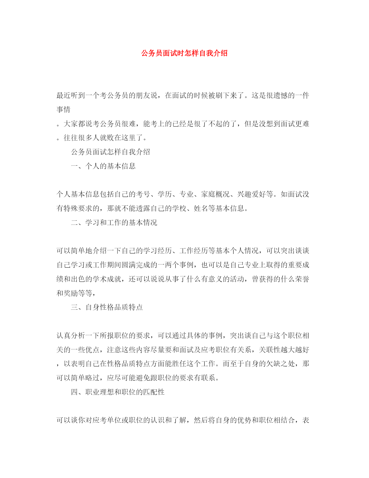 此资料由网络收集而来,如有侵权请告知上传者立即删除。资料共分享,我们负责传递知识。公务员面试时怎样自我介绍最近听到一个考公务员的朋友说,在面试的时候被刷下来了。这是很遗憾的一件事情。大家都说考公务员很难,能考上的已经是很了不起的了,但是没想到面试更难。往往很多人就败在这里了。公务员面试怎样自我介绍一、个人的基本信息个人基本信息包括自己的考号、学历、专业、家庭概况、兴趣爱好等。如面试没有特殊要求的,那就不能透露自己的学校、姓名等基本信息。二、学习和工作的基本情况可以简单地介绍一下自己的学习经历、工作经历等基