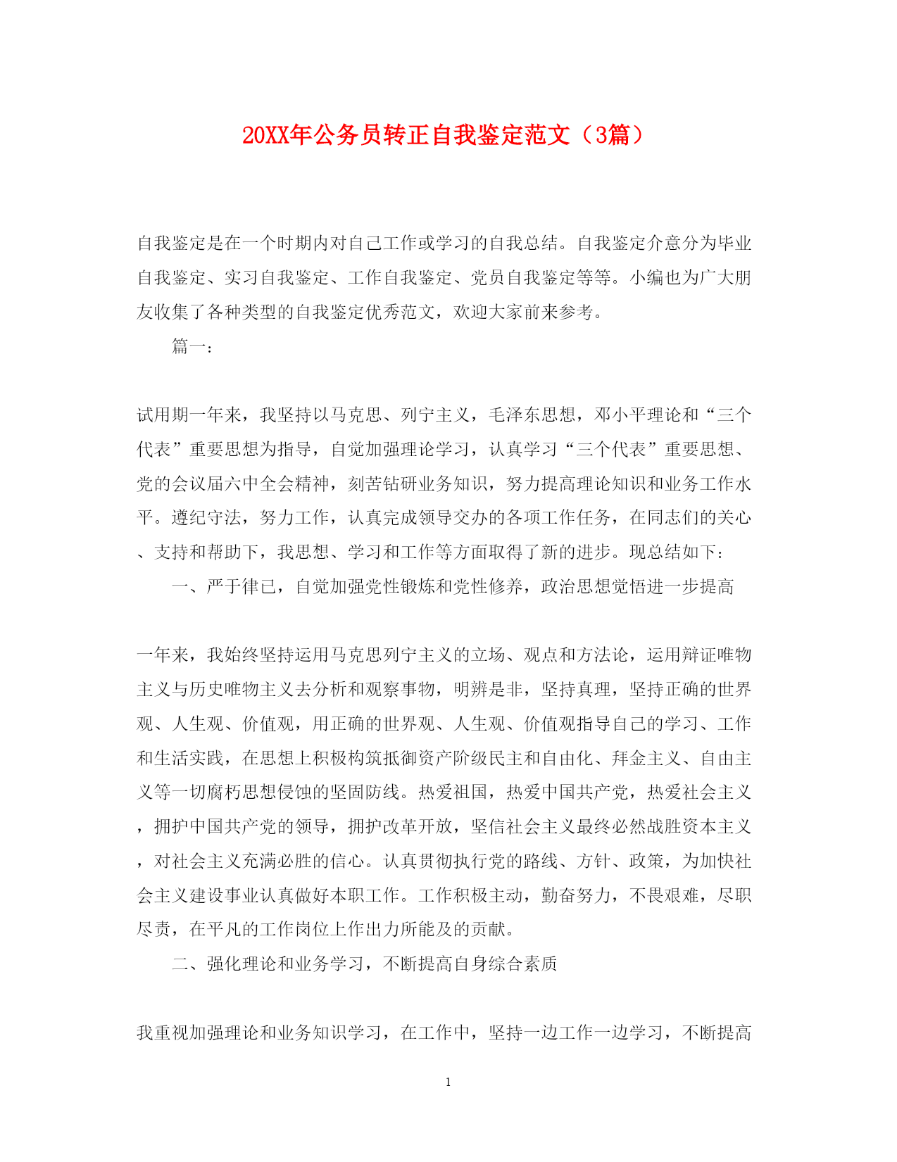此资料由网络收集而来,如有侵权请告知上传者立即删除。资料共分享,我们负责传递知识。PAGEPAGE620XX年公务员转正自我鉴定范文(3篇)自我鉴定是在一个时期内对自己工作或学习的自我总结。自我鉴定介意分为毕业自我鉴定、实习自我鉴定、工作自我鉴定、党员自我鉴定等等。小编也为广大朋友收集了各种类型的自我鉴定优秀范文,欢迎大家前来参考。篇一:试用期一年来,我坚持以马克思、列宁主义,毛泽东思想,邓小平理论和“三个代表”重要思想为指导,自觉加强理论学习,认真学习“三个代表”重要思想、党的会议届六中全会