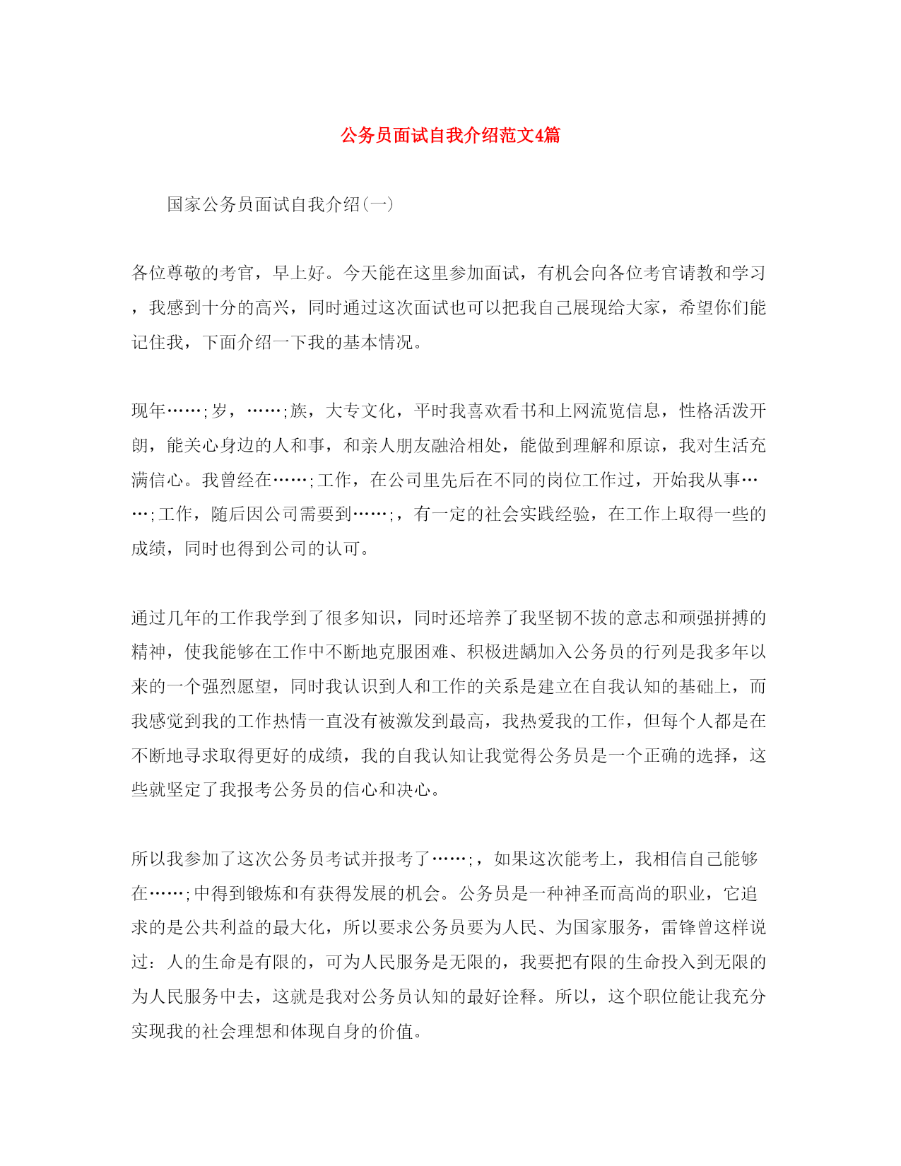 此资料由网络收集而来,如有侵权请告知上传者立即删除。资料共分享,我们负责传递知识。公务员面试自我介绍范文4篇国家公务员面试自我介绍(一)各位尊敬的考官,早上好。今天能在这里参加面试,有机会向各位考官请教和学习,我感到十分的高兴,同时通过这次面试也可以把我自己展现给大家,希望你们能记住我,下面介绍一下我的基本情况。现年……;岁,……;族,大专文化,平时我喜欢看书和上网流览信息,性格活泼开朗,能关心身边的人和事,和亲人朋友融洽相处,能做到理解和原谅,我对生活充满信心。我曾经在……;工作,在公司里先后在不同的岗