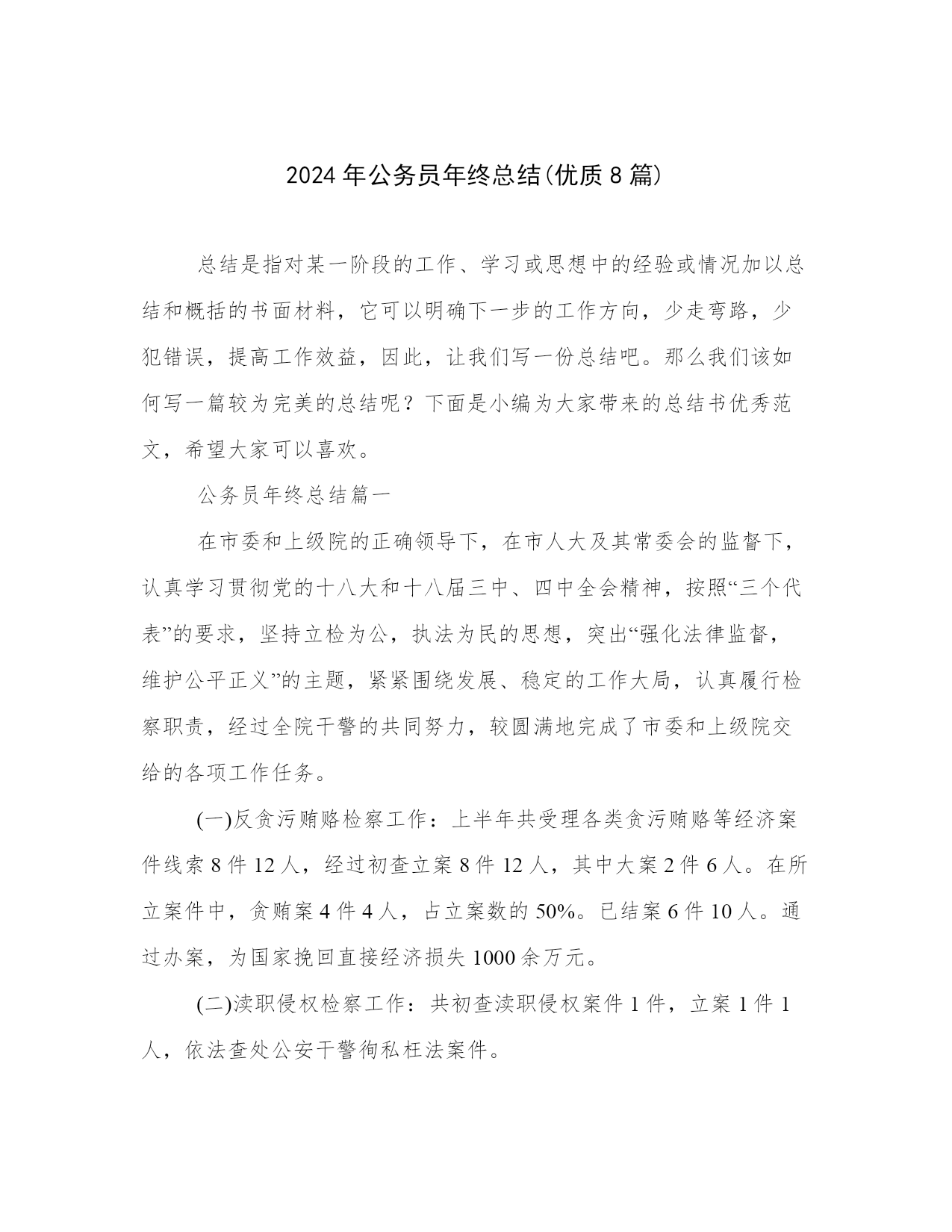 2024年公务员年终总结(优质8篇)总结是指对某一阶段的工作、学习或思想中的经验或情况加以总结和概括的书面材料,它可以明确下一步的工作方向,少走弯路,少犯错误,提高工作效益,因此,让我们写一份总结吧。那么我们该如何写一篇较为完美的总结呢?下面是小编为大家带来的总结书优秀范文,希望大家可以喜欢。公务员年终总结篇一在市委和上级院的正确领导下,在市人大及其常委会的监督下,认真学习贯彻党的十八大和十八届三中、四中全会精神,按照“三个代表”的要求,坚持立检为公,执法为民的思想,突出“强化法律监督,维护公平正义”的主