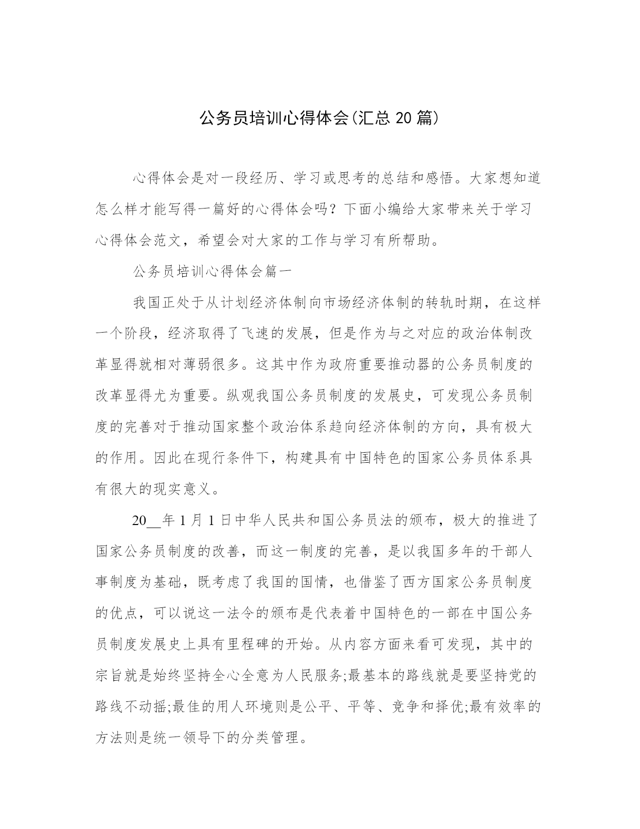 公务员培训心得体会(汇总20篇)心得体会是对一段经历、学习或思考的总结和感悟。大家想知道怎么样才能写得一篇好的心得体会吗?下面小编给大家带来关于学习心得体会范文,希望会对大家的工作与学习有所帮助。公务员培训心得体会篇一我国正处于从计划经济体制向市场经济体制的转轨时期,在这样一个阶段,经济取得了飞速的发展,但是作为与之对应的政治体制改革显得就相对薄弱很多。这其中作为政府重要推动器的公务员制度的改革显得尤为重要。纵观我国公务员制度的发展史,可发现公务员制度的完善对于推动国家整个政治体系趋向经济体制的方向,具有