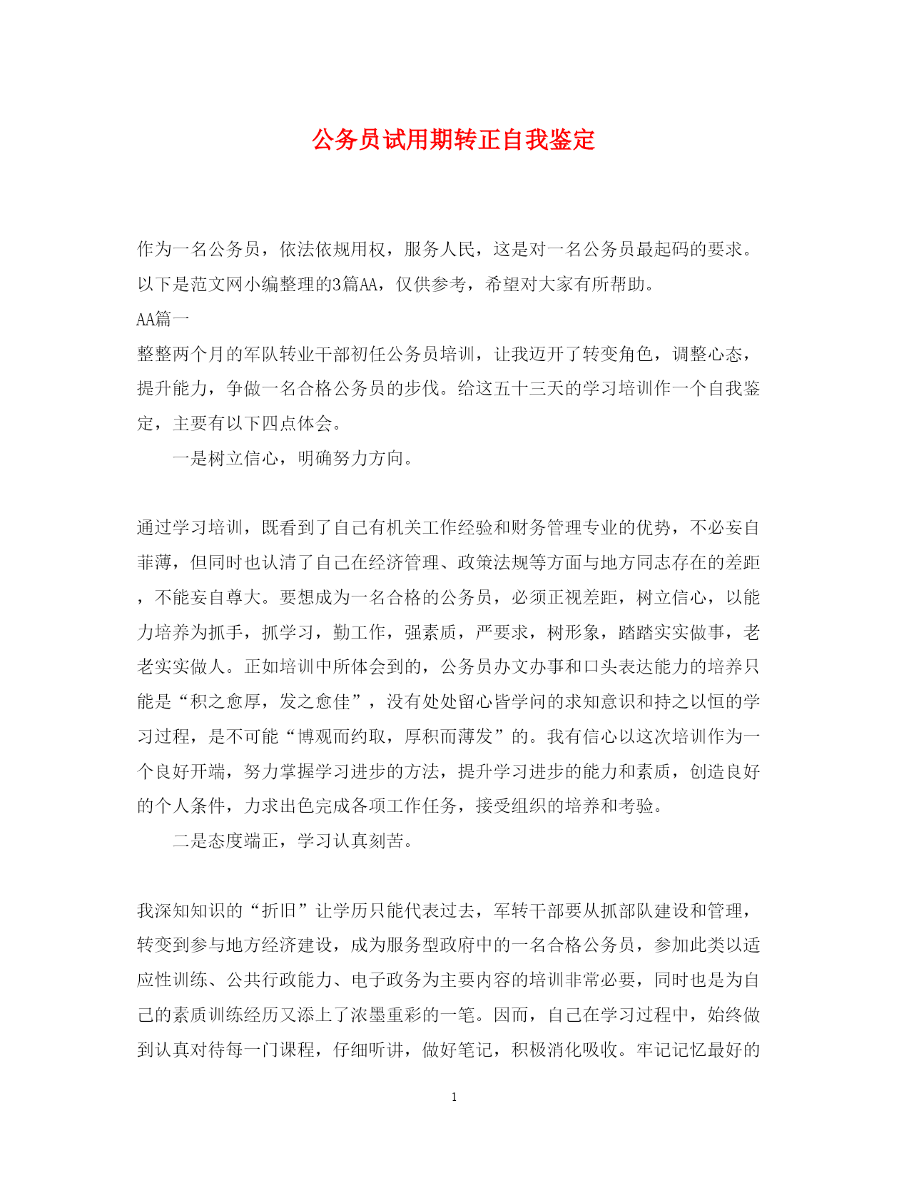 此资料由网络收集而来,如有侵权请告知上传者立即删除。资料共分享,我们负责传递知识。PAGEPAGE5公务员试用期转正自我鉴定作为一名公务员,依法依规用权,服务人民,这是对一名公务员最起码的要求。以下是范文网小编整理的3篇AA,仅供参考,希望对大家有所帮助。AA篇一整整两个月的军队转业干部初任公务员培训,让我迈开了转变角色,调整心态,提升能力,争做一名合格公务员的步伐。给这五十三天的学习培训作一个自我鉴定,主要有以下四点体会。一是树立信心,明确努力方向。通过学习培训,既看到了自己有机关工作经验和