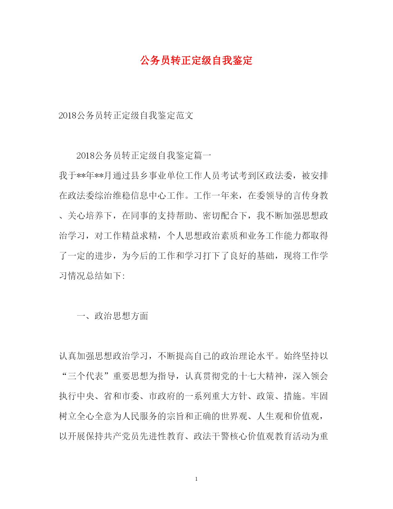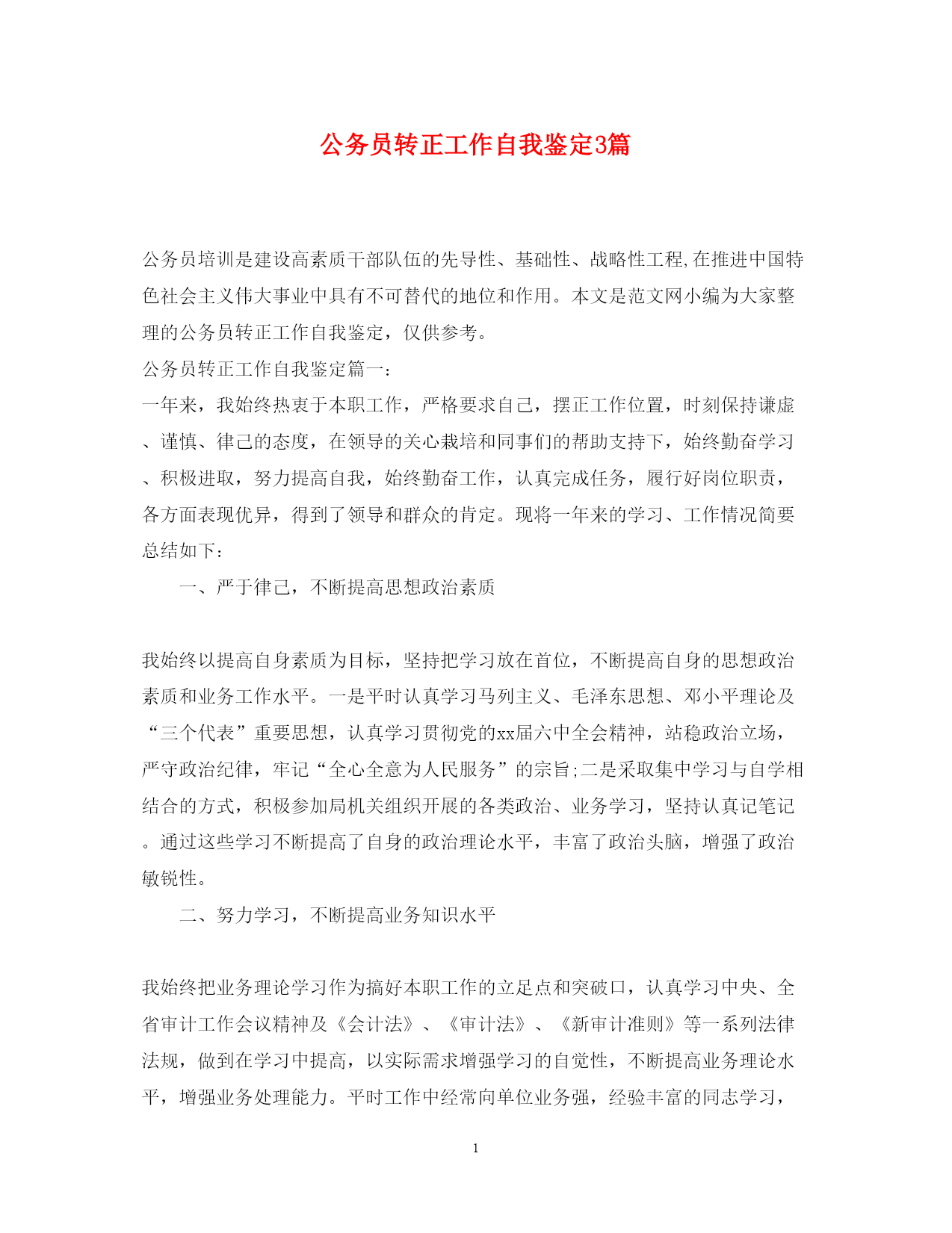 此资料由网络收集而来,如有侵权请告知上传者立即删除。资料共分享,我们负责传递知识。PAGEPAGE6公务员转正工作自我鉴定3篇公务员培训是建设高素质干部队伍的先导性、基础性、战略性工程,在推进中国特色社会主义伟大事业中具有不可替代的地位和作用。本文是范文网小编为大家整理的公务员转正工作自我鉴定,仅供参考。公务员转正工作自我鉴定篇一:一年来,我始终热衷于本职工作,严格要求自己,摆正工作位置,时刻保持谦虚、谨慎、律己的态度,在领导的关心栽培和同事们的帮助支持下,始终勤奋学习、积极进取,努力提高自我