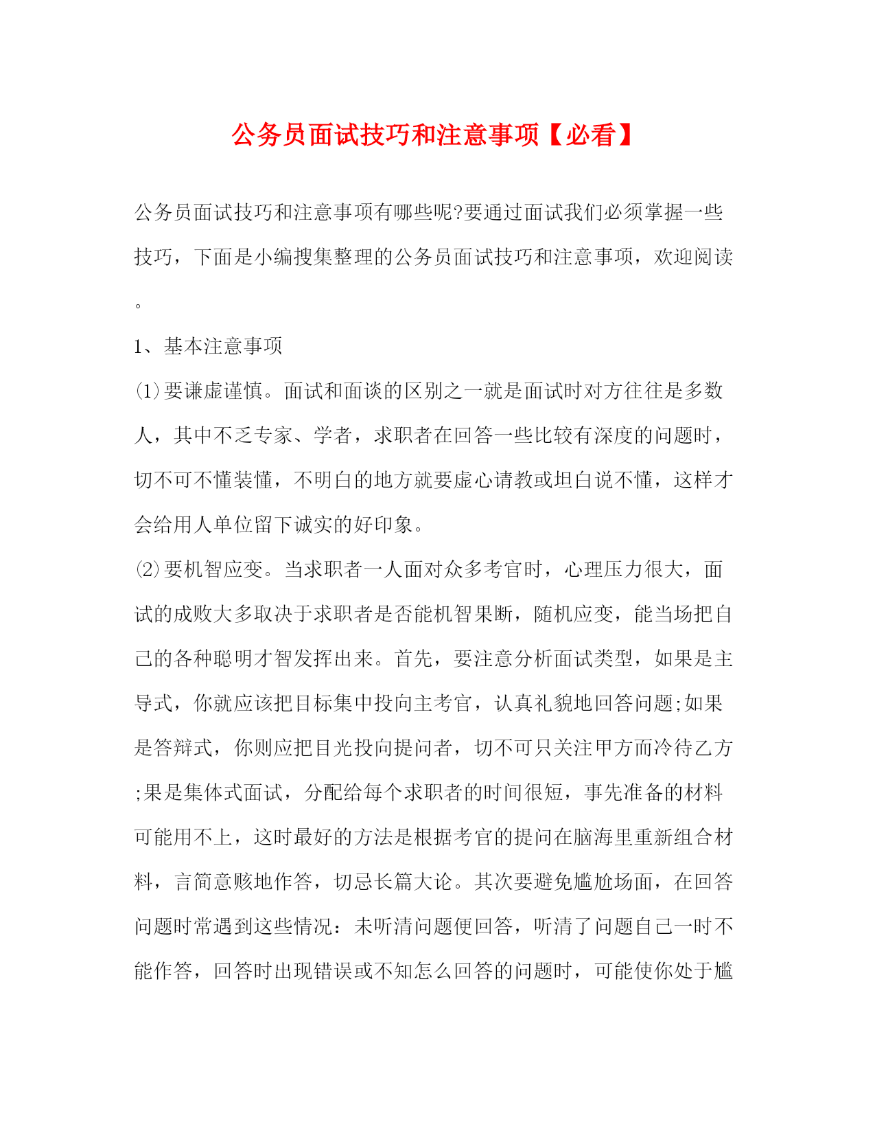PAGE此资料由网络收集而来,如有侵权请告知上传者立即删除。资料共分享,我们负责传递知识。公务员面试技巧和注意事项【必看】公务员面试技巧和注意事项有哪些呢?要通过面试我们必须掌握一些技巧,下面是小编搜集整理的公务员面试技巧和注意事项,欢迎阅读。1、基本注意事项(1)要谦虚谨慎。面试和面谈的区别之一就是面试时对方往往是多数人,其中不乏专家、学者,求职者在回答一些比较有深度的问题时,切不可不懂装懂,不明白的地方就要虚心请教或坦白说不懂,这样才会给用人单位留下诚实的好印象。(2)要机智应变。当求职者一人面