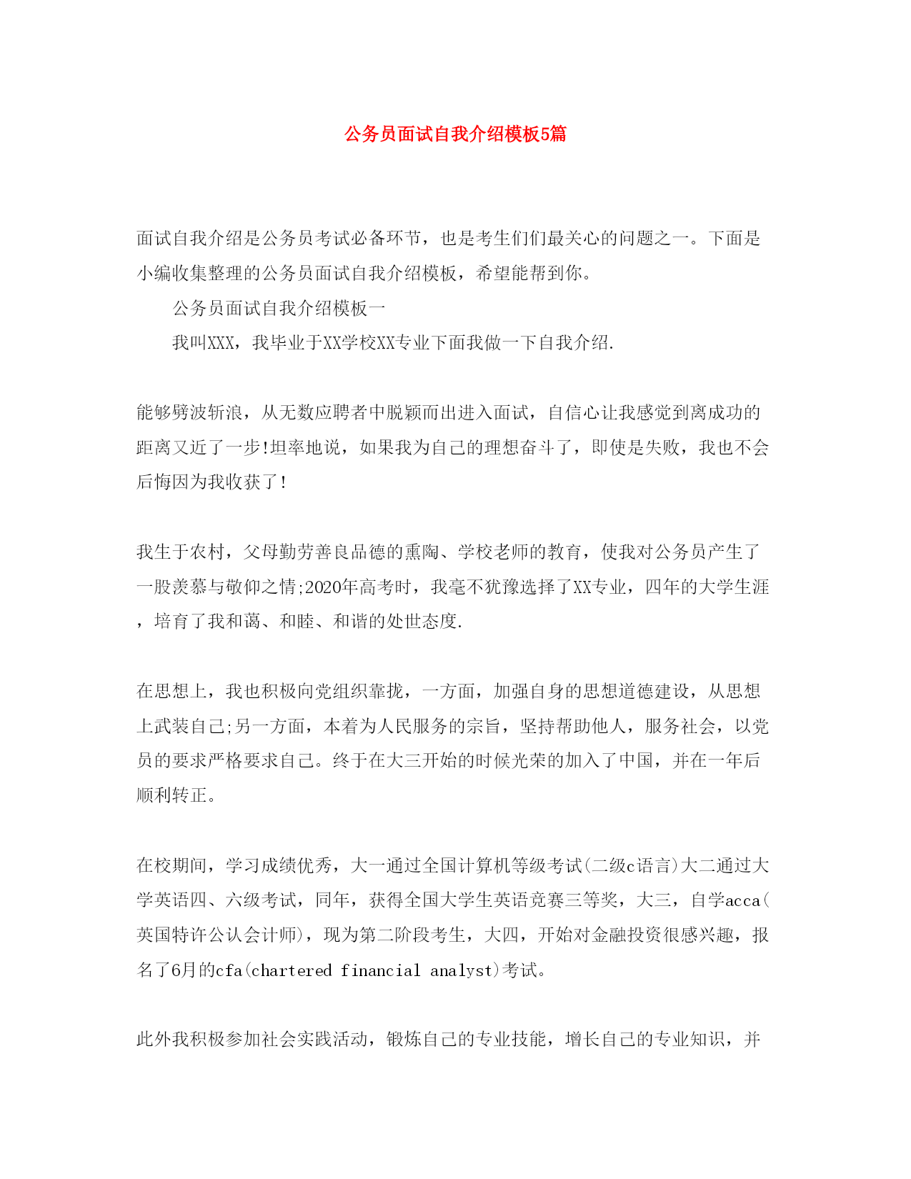 此资料由网络收集而来,如有侵权请告知上传者立即删除。资料共分享,我们负责传递知识。公务员面试自我介绍模板5篇面试自我介绍是公务员考试必备环节,也是考生们们最关心的问题之一。下面是小编收集整理的公务员面试自我介绍模板,希望能帮到你。公务员面试自我介绍模板一我叫XXX,我毕业于XX学校XX专业下面我做一下自我介绍.能够劈波斩浪,从无数应聘者中脱颖而出进入面试,自信心让我感觉到离成功的距离又近了一步!坦率地说,如果我为自己的理想奋斗了,即使是失败,我也不会后悔因为我收获了!我生于农村,父母勤劳善良品德的熏陶、学