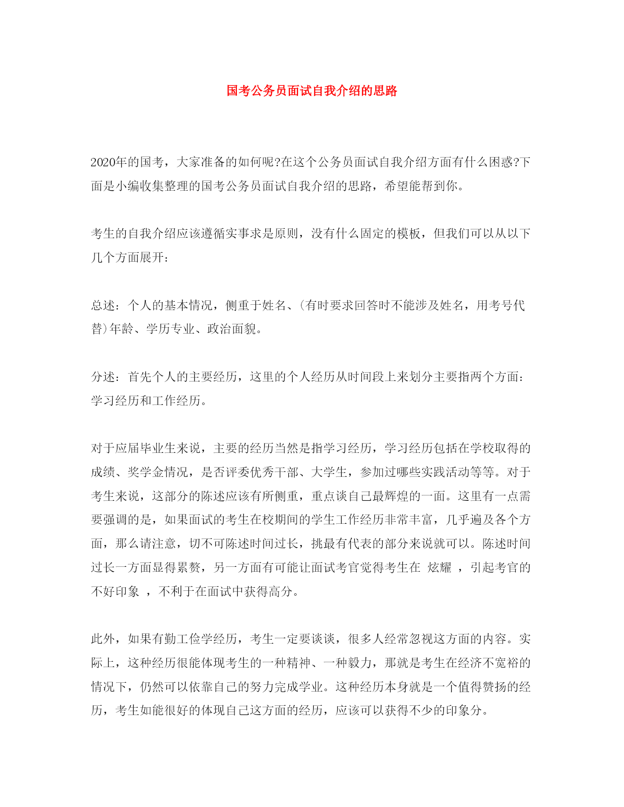 此资料由网络收集而来,如有侵权请告知上传者立即删除。资料共分享,我们负责传递知识。国考公务员面试自我介绍的思路2020年的国考,大家准备的如何呢?在这个公务员面试自我介绍方面有什么困惑?下面是小编收集整理的国考公务员面试自我介绍的思路,希望能帮到你。考生的自我介绍应该遵循实事求是原则,没有什么固定的模板,但我们可以从以下几个方面展开:总述:个人的基本情况,侧重于姓名、(有时要求回答时不能涉及姓名,用考号代替)年龄、学历专业、政治面貌。分述:首先个人的主要经历,这里的个人经历从时间段上来划分主要指两个方面: