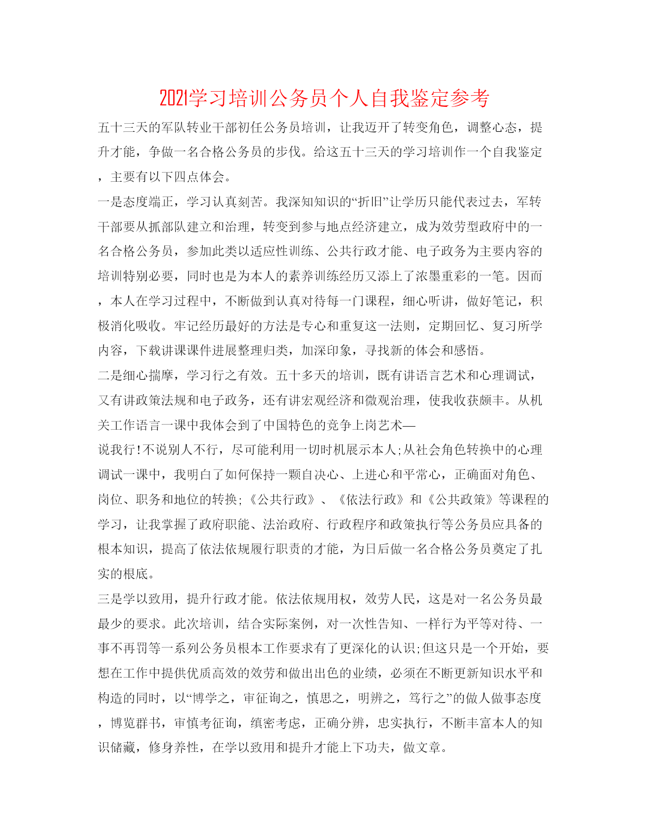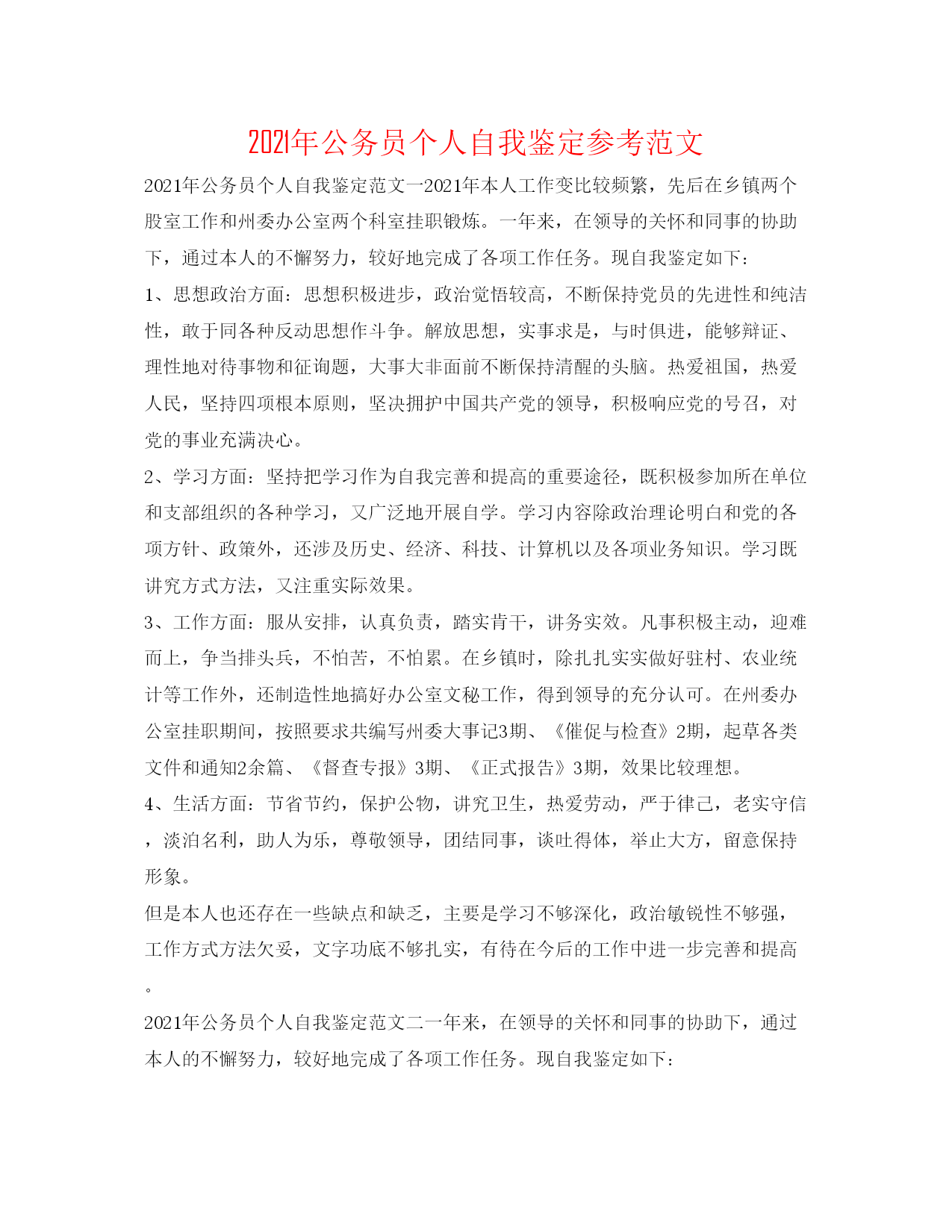 2021年公务员个人自我鉴定参考范文2021年公务员个人自我鉴定范文一2021年本人工作变比较频繁,先后在乡镇两个股室工作和州委办公室两个科室挂职锻炼。一年来,在领导的关怀和同事的协助下,通过本人的不懈努力,较好地完成了各项工作任务。现自我鉴定如下:1、思想政治方面:思想积极进步,政治觉悟较高,不断保持党员的先进性和纯洁性,敢于同各种反动思想作斗争。解放思想,实事求是,与时俱进,能够辩证、理性地对待事物和征询题,大事大非面前不断保持清醒的头脑。热爱祖国,热爱人民,坚持四项根本原则,坚决拥护中国共产党的领导