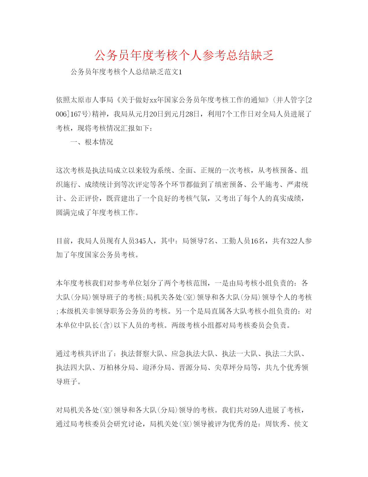 公务员年度考核个人参考总结缺乏公务员年度考核个人总结缺乏范文1依照太原市人事局《关于做好xx年国家公务员年度考核工作的通知》(并人管字[2006]167号)精神,我局从元月20日到元月28日,利用7个工作日对全局人员进展了考核,现将考核情况汇报如下:一、根本情况这次考核是执法局成立以来较为系统、全面、正规的一次考核,从考核预备、组织施行、成绩统计到等次评定等各个环节都做到了缜密预备、公平施考、严肃统计、公正评价,既营建出了一个良好的考核气氛,又考出了每个人的真实成绩,圆满完成了年度考核工作。目前,我局人员