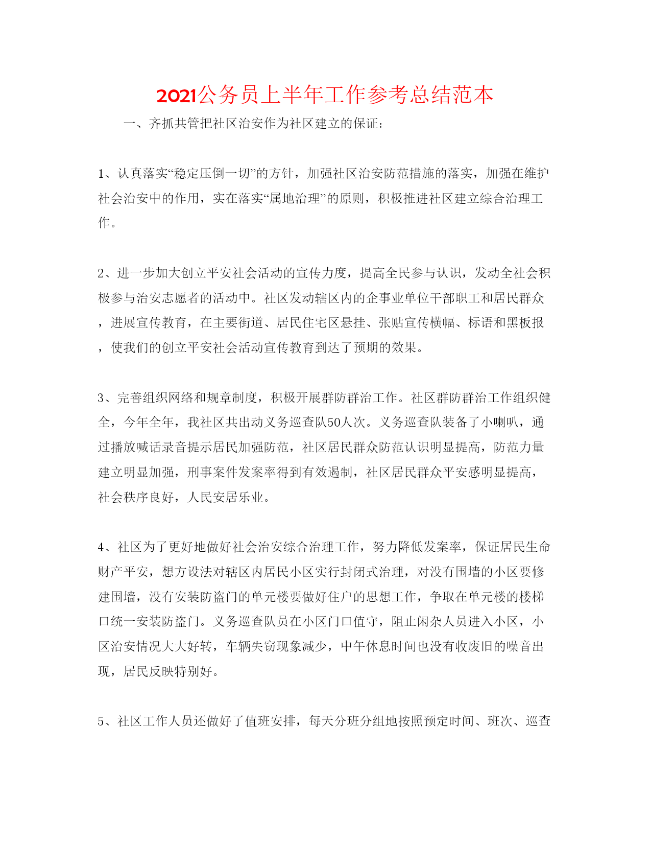 2021公务员上半年工作参考总结范本一、齐抓共管把社区治安作为社区建立的保证:1、认真落实“稳定压倒一切”的方针,加强社区治安防范措施的落实,加强在维护社会治安中的作用,实在落实“属地治理”的原则,积极推进社区建立综合治理工作。2、进一步加大创立平安社会活动的宣传力度,提高全民参与认识,发动全社会积极参与治安志愿者的活动中。社区发动辖区内的企事业单位干部职工和居民群众,进展宣传教育,在主要街道、居民住宅区悬挂、张贴宣传横幅、标语和黑板报,使我们的创立平安社会活动宣传教育到达了预期的效果。3、完善组织网络和