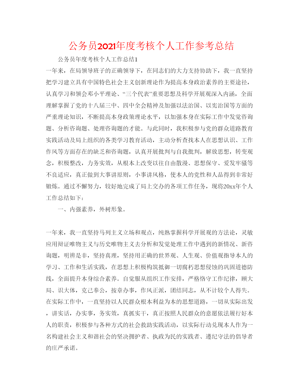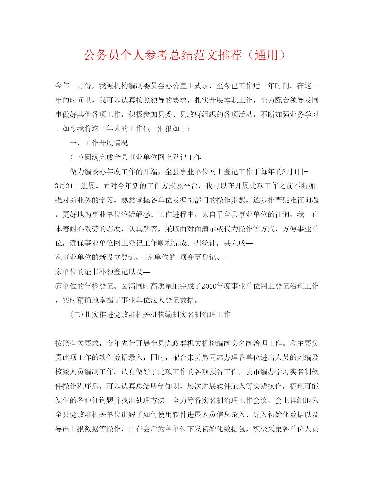 公务员个人参考总结范文推荐(通用)今年一月份,我被机构编制委员会办公室正式录,至今已工作近一年时间。在这一年的时间里,我可以认真按照领导的要求,扎实开展本职工作,全力配合领导及同事做好其他各项工作,积极参加县委、县政府组织的各项活动,不断加强业务学习。如今我将这一年来的工作做一汇报如下:一、工作开展情况(一)圆满完成全县事业单位网上登记工作做为编委办年度工作的开端,全县事业单位网上登记工作于每年的3月1日-3月31日进展。面对今年新的工作方式及平台,我可以在开展此项工作之前不断加强对新业务的学习,熟悉掌握