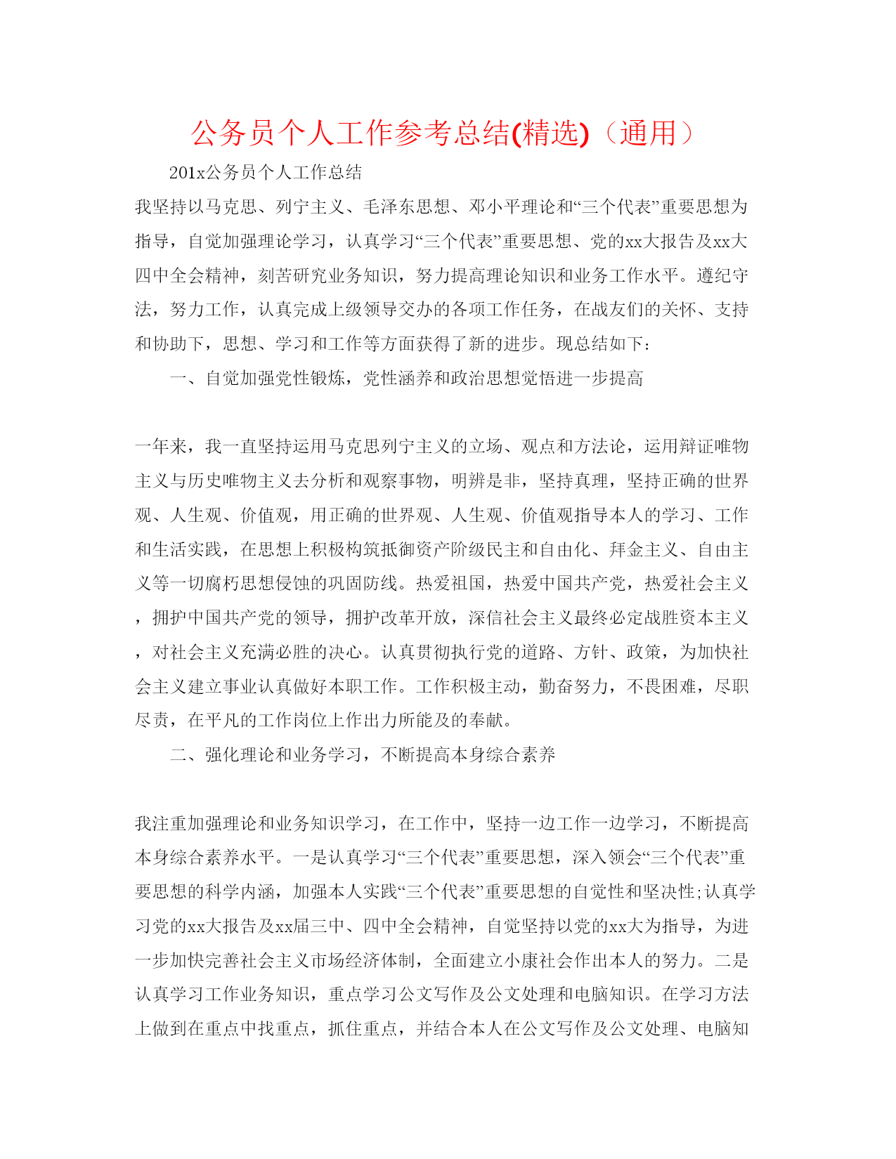 公务员个人工作参考总结(精选)(通用)201x公务员个人工作总结我坚持以马克思、列宁主义、毛泽东思想、邓小平理论和“三个代表”重要思想为指导,自觉加强理论学习,认真学习“三个代表”重要思想、党的xx大报告及xx大四中全会精神,刻苦研究业务知识,努力提高理论知识和业务工作水平。遵纪守法,努力工作,认真完成上级领导交办的各项工作任务,在战友们的关怀、支持和协助下,思想、学习和工作等方面获得了新的进步。现总结如下:一、自觉加强党性锻炼,党性涵养和政治思想觉悟进一步提高一年来,我一直坚持运用马克思列宁主义的立场、