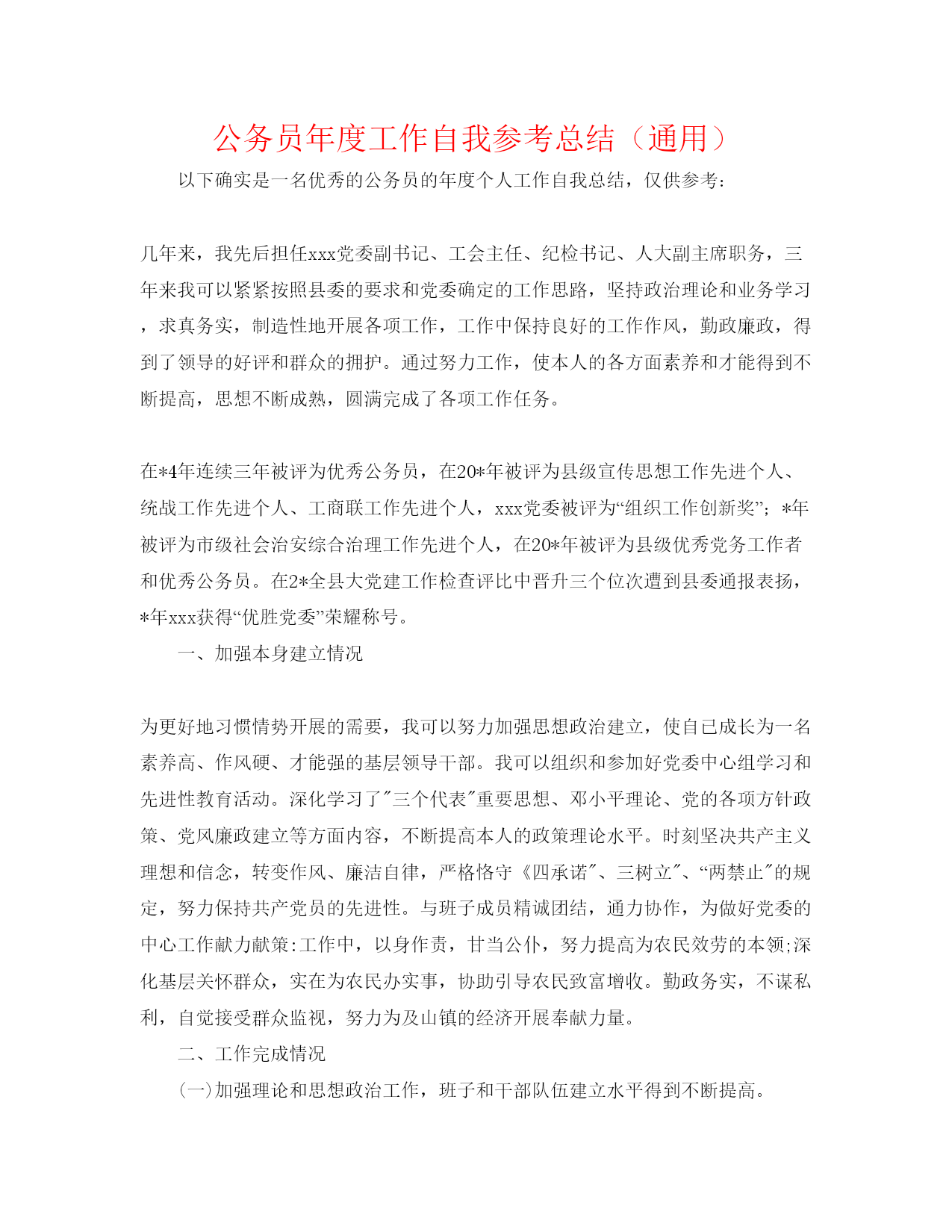 公务员年度工作自我参考总结(通用)以下确实是一名优秀的公务员的年度个人工作自我总结,仅供参考:几年来,我先后担任xxx党委副书记、工会主任、纪检书记、人大副主席职务,三年来我可以紧紧按照县委的要求和党委确定的工作思路,坚持政治理论和业务学习,求真务实,制造性地开展各项工作,工作中保持良好的工作作风,勤政廉政,得到了领导的好评和群众的拥护。通过努力工作,使本人的各方面素养和才能得到不断提高,思想不断成熟,圆满完成了各项工作任务。在*4年连续三年被评为优秀公务员,在20*年被评为县级宣传思想工作先进个人、统战