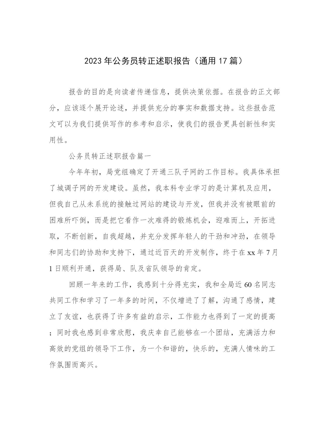 2023年公务员转正述职报告(通用17篇)报告的目的是向读者传递信息,提供决策依据。在报告的正文部分,应该逐个展开论述,并提供充分的事实和数据支持。这些报告范文可以为我们提供写作的参考和启示,使我们的报告更具创新性和实用性。公务员转正述职报告篇一今年年初,局党组确定了开通三队子网的工作目标。我具体承担了城调子网的开发建设。虽然,我本科专业学习的是计算机及应用,但我自己从未系统的接触过网站的建设与开发,但我并没有被眼前的困难所吓倒,而是把它看作一次难得的锻炼机会,迎难而上,开拓进取,不断创新,自我超越,并充