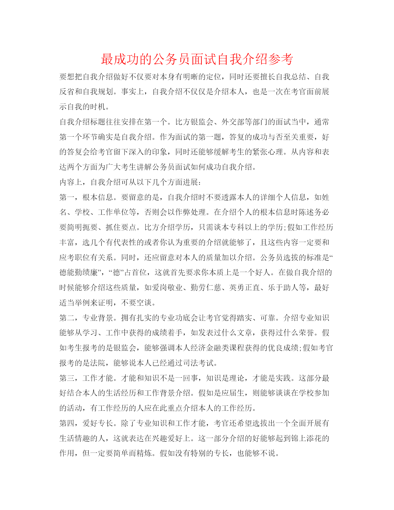 最成功的公务员面试自我介绍参考要想把自我介绍做好不仅要对本身有明晰的定位,同时还要擅长自我总结、自我反省和自我规划。事实上,自我介绍不仅仅是介绍本人,也是一次在考官面前展示自我的时机。自我介绍标题往往安排在第一个。比方银监会、外交部等部门的面试当中,通常第一个环节确实是自我介绍。作为面试的第一题,答复的成功与否至关重要,好的答复会给考官留下深入的印象,同时还能够缓解考生的紧张心理。从内容和表达两个方面为广大考生讲解公务员面试如何成功自我介绍。内容上,自我介绍可从以下几个方面进展:第一,根本信息。要留意的是