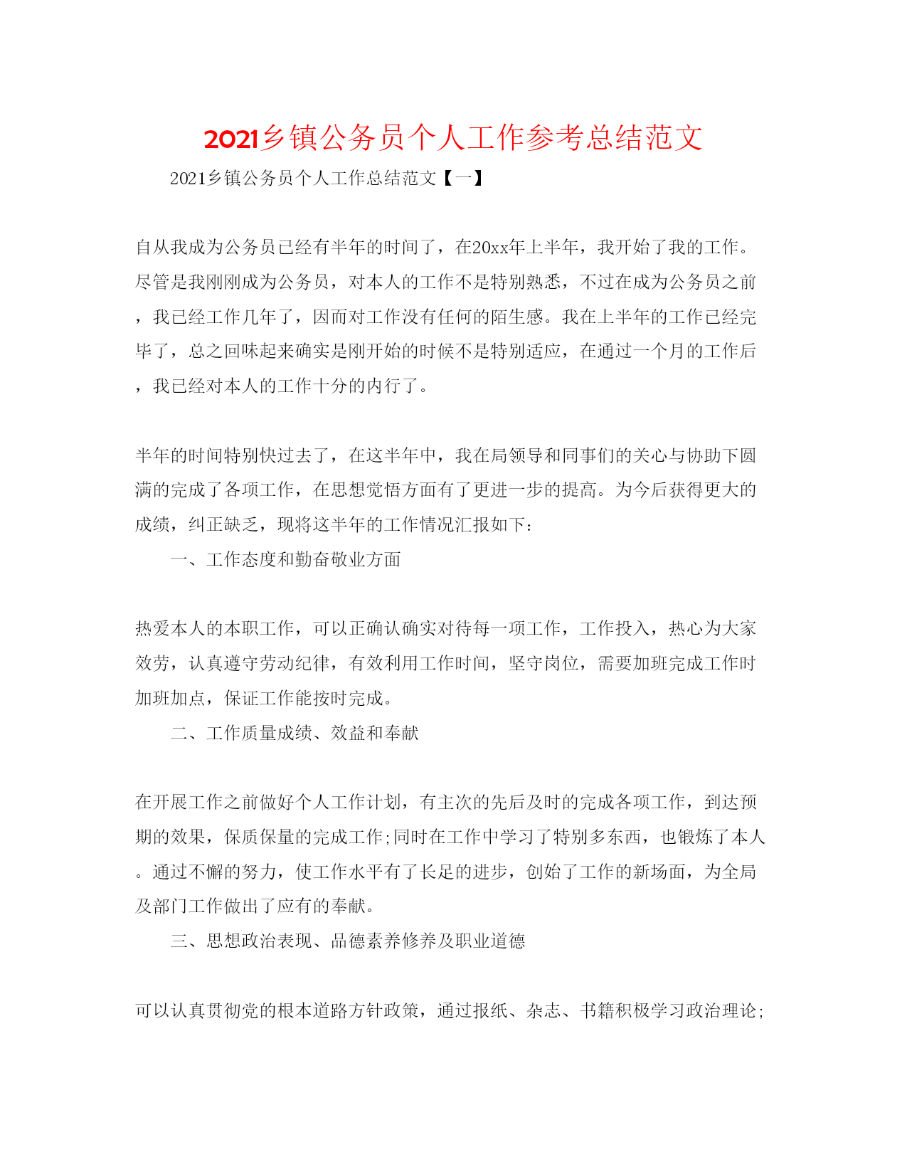 2021乡镇公务员个人工作参考总结范文2021乡镇公务员个人工作总结范文【一】自从我成为公务员已经有半年的时间了,在20xx年上半年,我开始了我的工作。尽管是我刚刚成为公务员,对本人的工作不是特别熟悉,不过在成为公务员之前,我已经工作几年了,因而对工作没有任何的陌生感。我在上半年的工作已经完毕了,总之回味起来确实是刚开始的时候不是特别适应,在通过一个月的工作后,我已经对本人的工作十分的内行了。半年的时间特别快过去了,在这半年中,我在局领导和同事们的关心与协助下圆满的完成了各项工作,在思想觉悟方面有了更进一