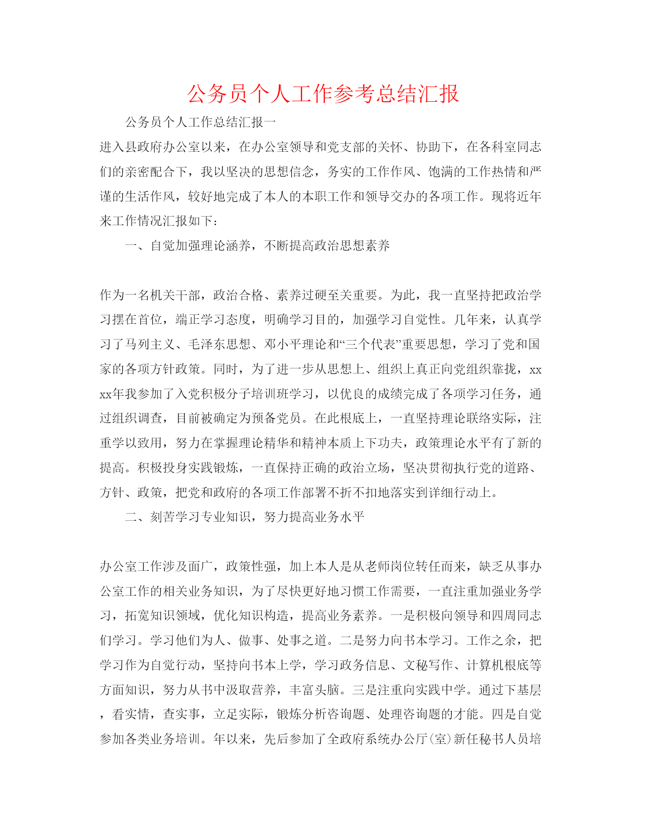公务员个人工作参考总结汇报公务员个人工作总结汇报一进入县政府办公室以来,在办公室领导和党支部的关怀、协助下,在各科室同志们的亲密配合下,我以坚决的思想信念,务实的工作作风、饱满的工作热情和严谨的生活作风,较好地完成了本人的本职工作和领导交办的各项工作。现将近年来工作情况汇报如下:一、自觉加强理论涵养,不断提高政治思想素养作为一名机关干部,政治合格、素养过硬至关重要。为此,我一直坚持把政治学习摆在首位,端正学习态度,明确学习目的,加强学习自觉性。几年来,认真学习了马列主义、毛泽东思想、邓小平理论和“三个代表