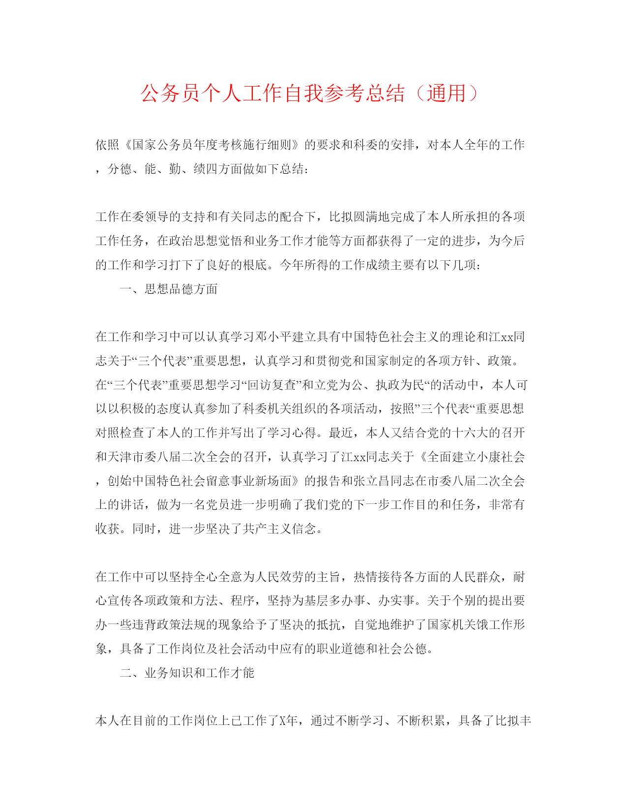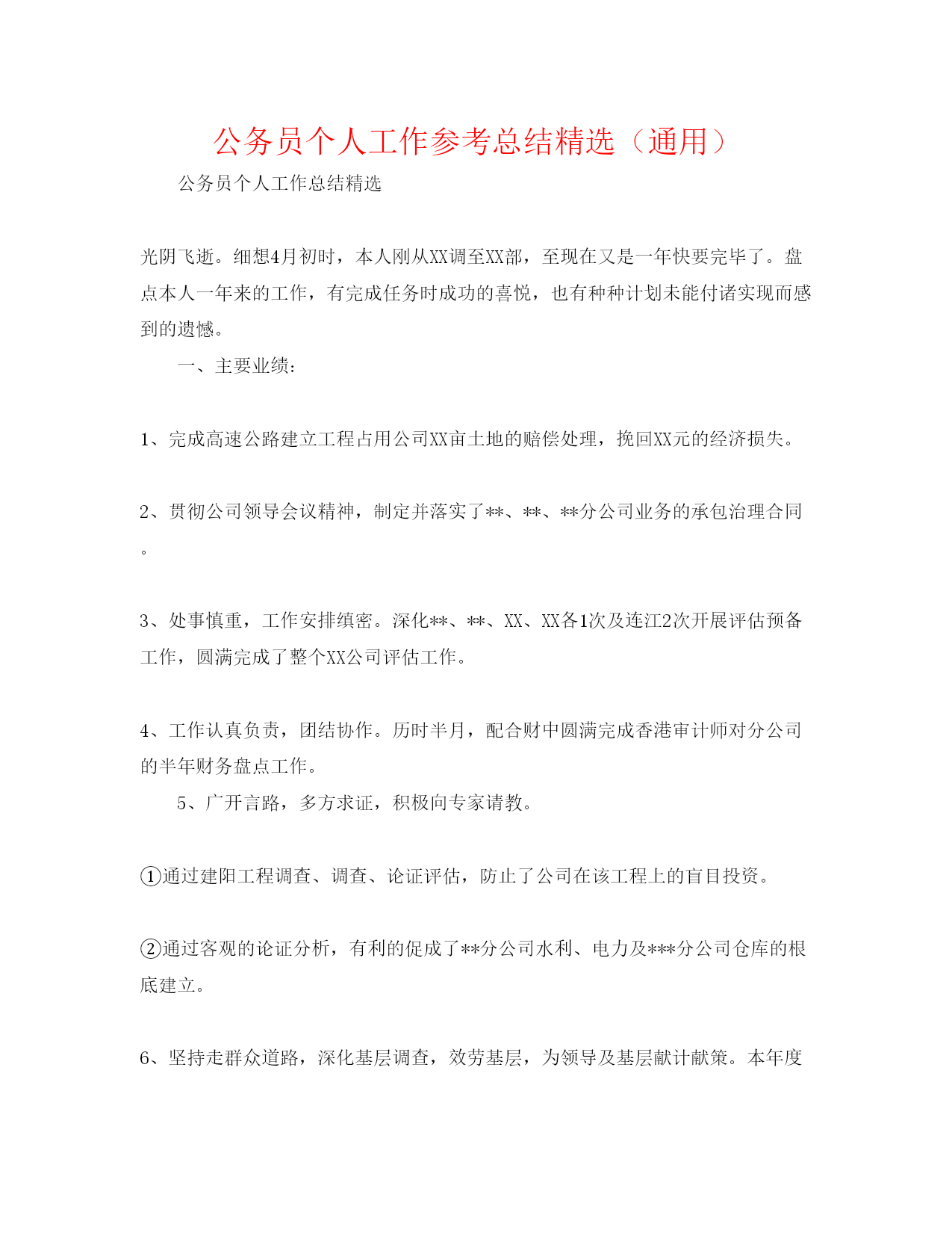 公务员个人工作参考总结精选(通用)公务员个人工作总结精选光阴飞逝。细想4月初时,本人刚从XX调至XX部,至现在又是一年快要完毕了。盘点本人一年来的工作,有完成任务时成功的喜悦,也有种种计划未能付诸实现而感到的遗憾。一、主要业绩:1、完成高速公路建立工程占用公司XX亩土地的赔偿处理,挽回XX元的经济损失。2、贯彻公司领导会议精神,制定并落实了**、**、**分公司业务的承包治理合同。3、处事慎重,工作安排缜密。深化**、**、XX、XX各1次及连江2次开展评估预备工作,圆满完成了整个XX公司评估工作。4、工