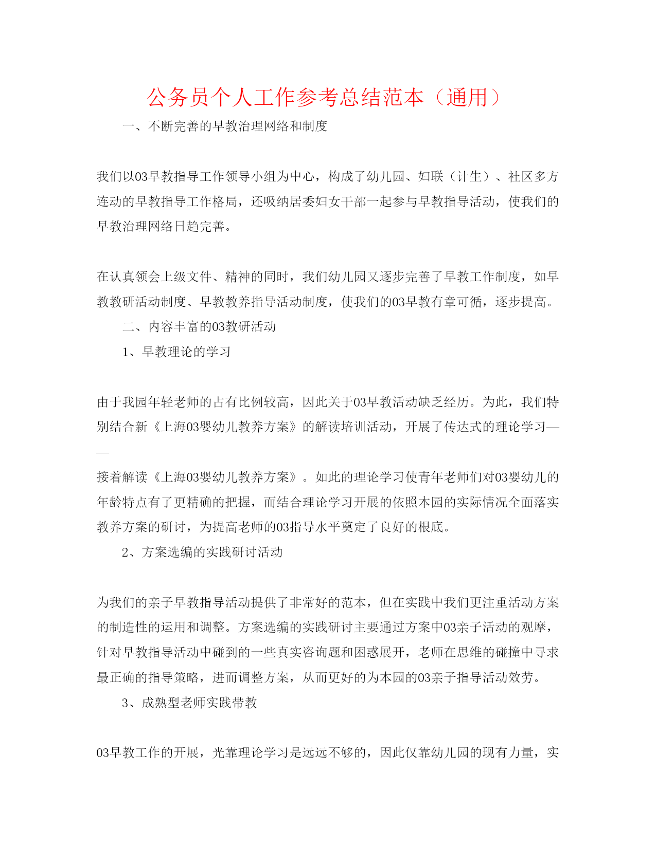 公务员个人工作参考总结范本(通用)一、不断完善的早教治理网络和制度我们以03早教指导工作领导小组为中心,构成了幼儿园、妇联(计生)、社区多方连动的早教指导工作格局,还吸纳居委妇女干部一起参与早教指导活动,使我们的早教治理网络日趋完善。在认真领会上级文件、精神的同时,我们幼儿园又逐步完善了早教工作制度,如早教教研活动制度、早教教养指导活动制度,使我们的03早教有章可循,逐步提高。二、内容丰富的03教研活动1、早教理论的学习由于我园年轻老师的占有比例较高,因此关于03早教活动缺乏经历。为此,我们特别结合新《上