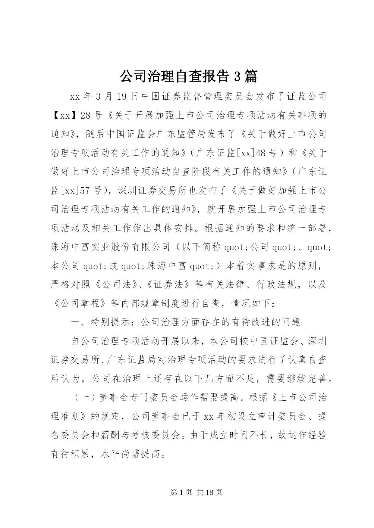 第PAGE\*Arabic\*MERGEFORMAT18页共NUMPAGES\*MERGEFORMAT18页公司治理自查报告3篇xx年3月19日中国证券监督管理委员会发布了证监公司【xx】28号《关于开展加强上市公司治理专项活动有关事项的通知》,随后中国证监会广东监管局发布了《关于做好上市公司治理专项活动有关工作的通知》(广东证监[xx]48号)和《关于做好上市公司治理专项活动自查阶段有关工作的通知》(广东证监[xx]57号),深圳证券交易所也发布了《关于做好加强上市公司治理专项活动有关工作的