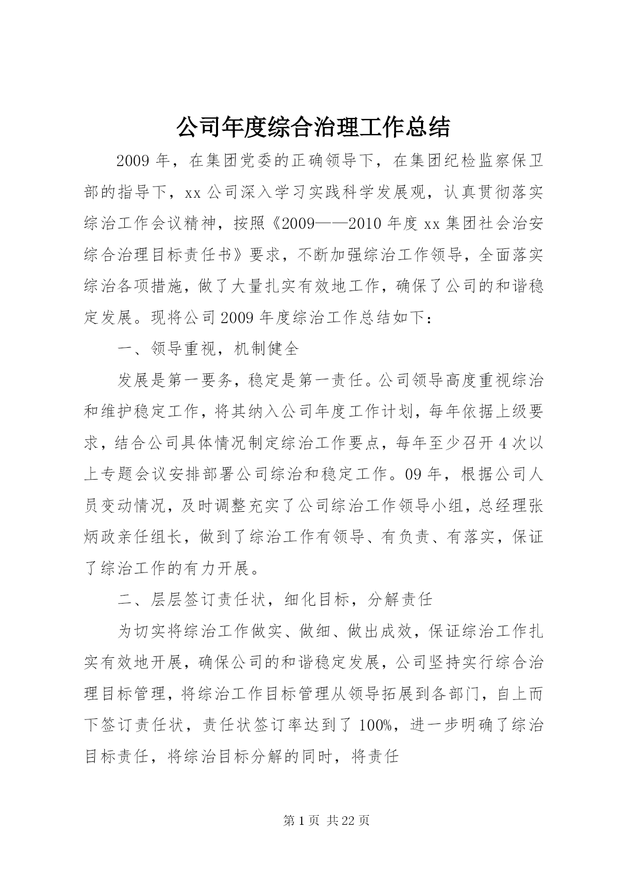 第PAGE\*Arabic\*MERGEFORMAT22页共NUMPAGES\*MERGEFORMAT22页公司年度综合治理工作总结2009年,在集团党委的正确领导下,在集团纪检监察保卫部的指导下,xx公司深入学习实践科学发展观,认真贯彻落实综治工作会议精神,按照《2009——2010年度xx集团社会治安综合治理目标责任书》要求,不断加强综治工作领导,全面落实综治各项措施,做了大量扎实有效地工作,确保了公司的和谐稳定发展。现将公司2009年度综治工作总结如下:一、领导重视,机制健全发展是第一要