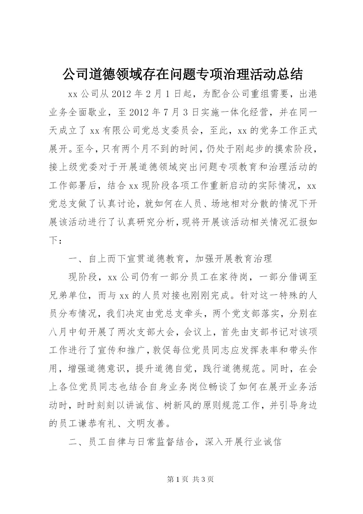 第PAGE\*Arabic\*MERGEFORMAT3页共NUMPAGES\*MERGEFORMAT3页公司道德领域存在问题专项治理活动总结xx公司从2012年2月1日起,为配合公司重组需要,出港业务全面歇业,至2012年7月3日实施一体化经营,并在同一天成立了xx有限公司党总支委员会,至此,xx的党务工作正式展开。至今,只有两个月不到的时间,仍处于刚起步的摸索阶段,接上级党委对于开展道德领域突出问题专项教育和治理活动的工作部署后,结合xx现阶段各项工作重新启动的实际情况,xx党总支做了认真讨