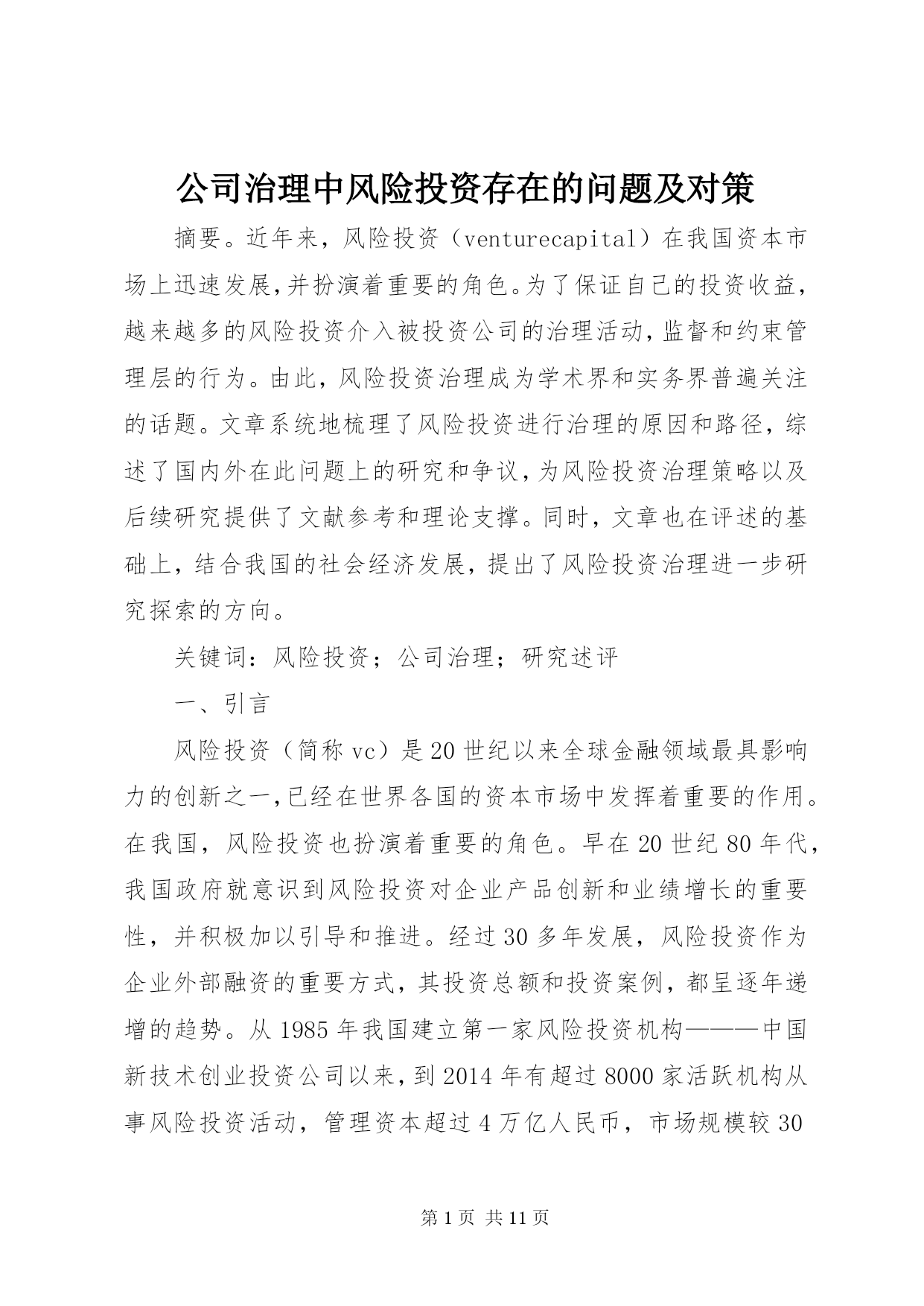 第PAGE\*Arabic\*MERGEFORMAT11页共NUMPAGES\*MERGEFORMAT11页公司治理中风险投资存在的问题及对策摘要。近年来,风险投资(venturecapital)在我国资本市场上迅速发展,并扮演着重要的角色。为了保证自己的投资收益,越来越多的风险投资介入被投资公司的治理活动,监督和约束管理层的行为。由此,风险投资治理成为学术界和实务界普遍关注的话题。文章系统地梳理了风险投资进行治理的原因和路径,综述了国内外在此问题上的研究和争议,为风险投资治理策略以及后续研究