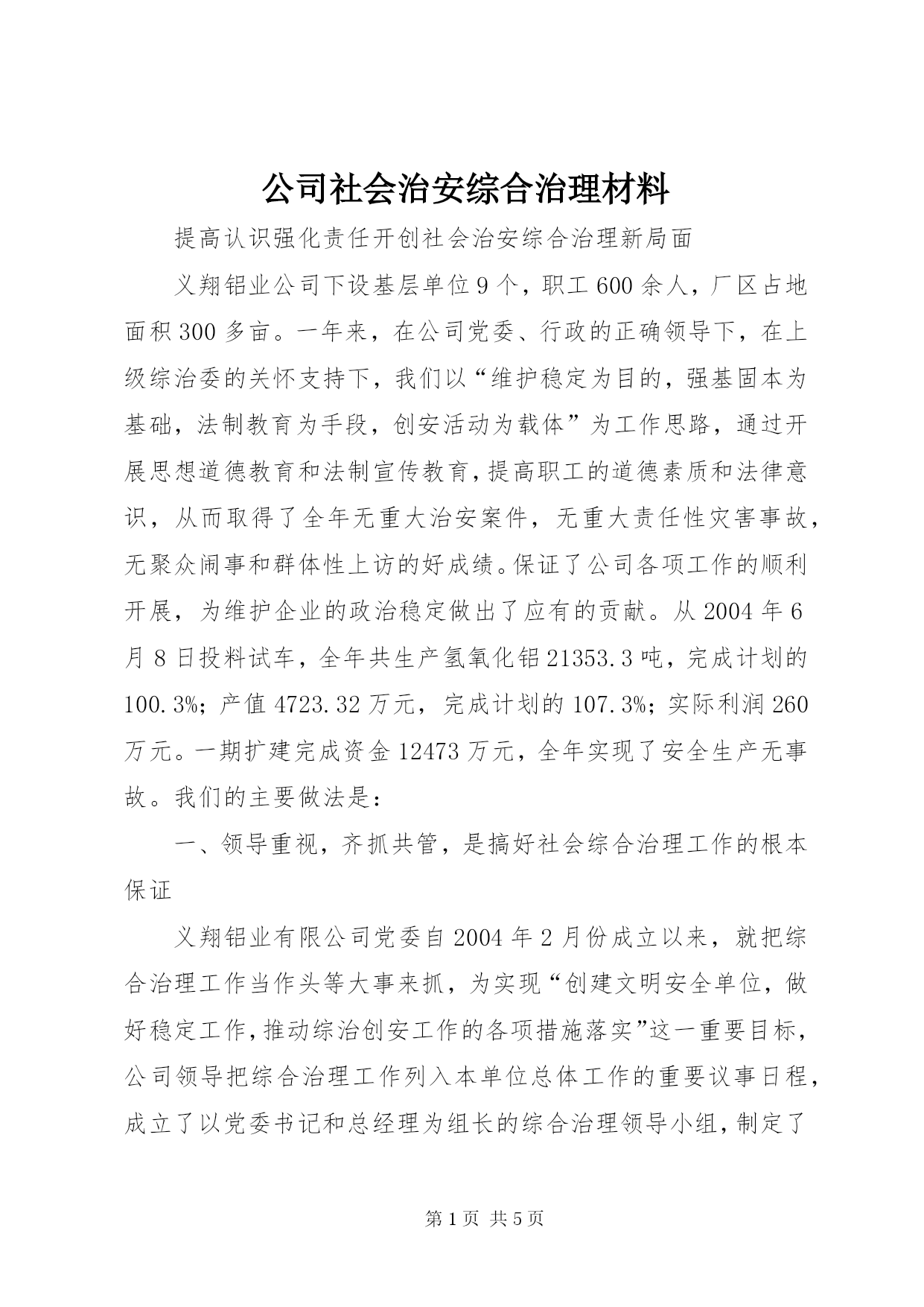 第PAGE\*Arabic\*MERGEFORMAT5页共NUMPAGES\*MERGEFORMAT5页公司社会治安综合治理材料提高认识强化责任开创社会治安综合治理新局面义翔铝业公司下设基层单位9个,职工600余人,厂区占地面积300多亩。一年来,在公司党委、行政的正确领导下,在上级综治委的关怀支持下,我们以“维护稳定为目的,强基固本为基础,法制教育为手段,创安活动为载体”为工作思路,通过开展思想道德教育和法制宣传教育,提高职工的道德素质和法律意识,从而取得了全年无重大治安案件,无重大责任性灾