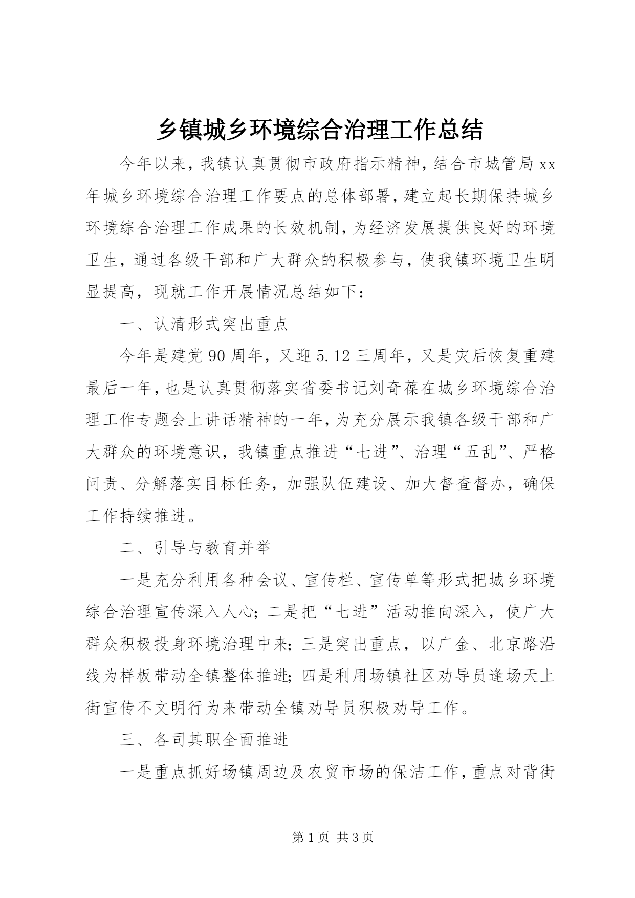 第PAGE\*Arabic\*MERGEFORMAT3页共NUMPAGES\*MERGEFORMAT3页乡镇城乡环境综合治理工作总结今年以来,我镇认真贯彻市政府指示精神,结合市城管局xx年城乡环境综合治理工作要点的总体部署,建立起长期保持城乡环境综合治理工作成果的长效机制,为经济发展提供良好的环境卫生,通过各级干部和广大群众的积极参与,使我镇环境卫生明显提高,现就工作开展情况总结如下:一、认清形式突出重点今年是建党90周年,又迎5.12三周年,又是灾后恢复重建最后一年,也是认真贯彻落实省委书记